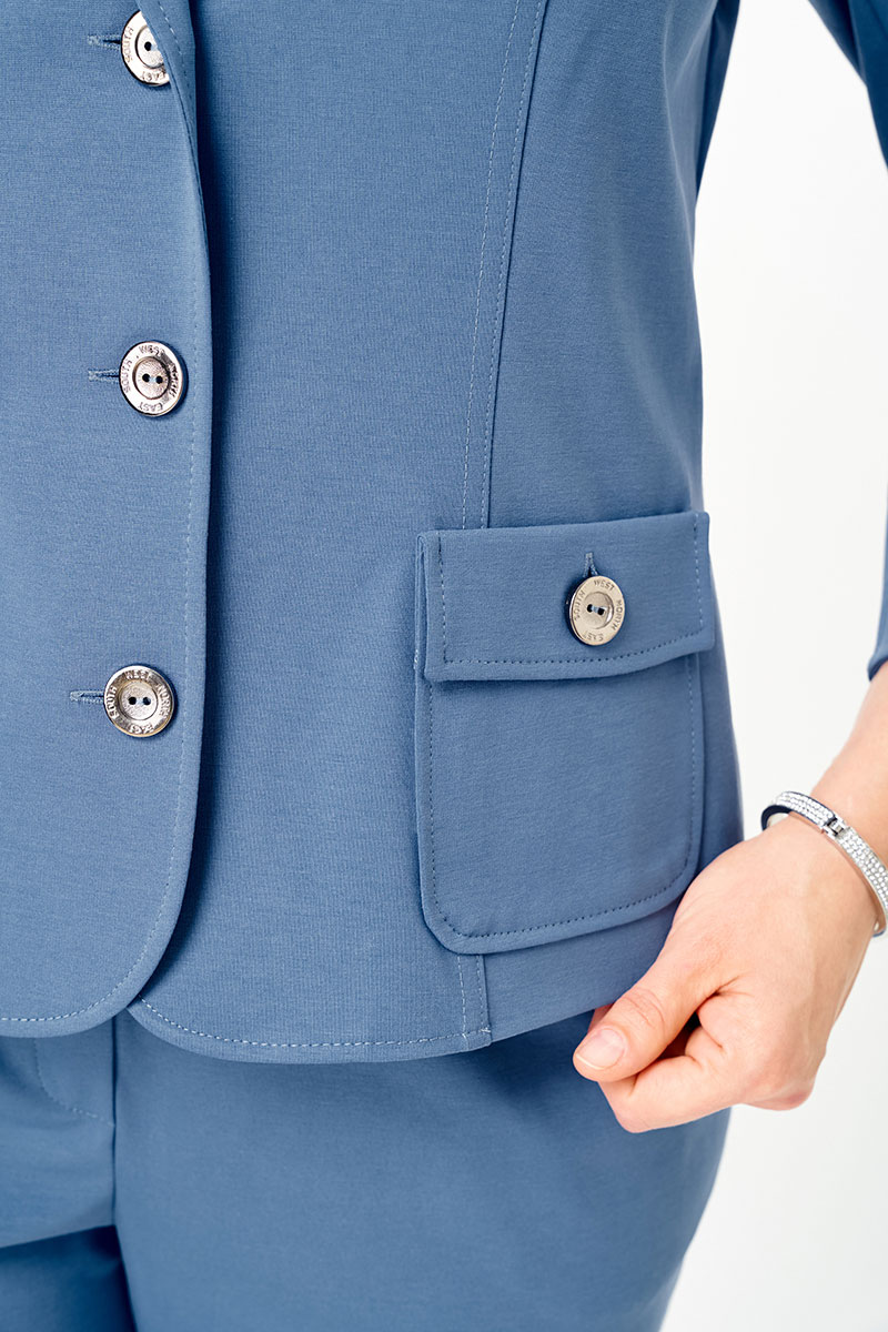 Жакет полуприлегающего силуэта с функциональными накладными карманами создает точеный силуэт - идеальная классика. Застежка на 3 пуговицы. Рукав три четверти с отворотом, без подкладки.