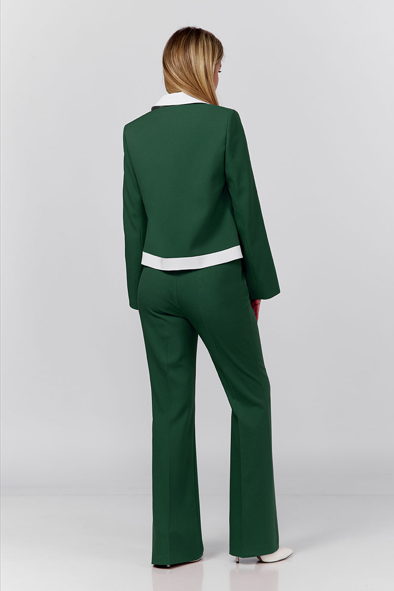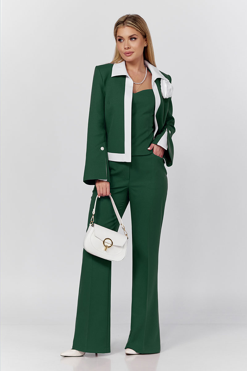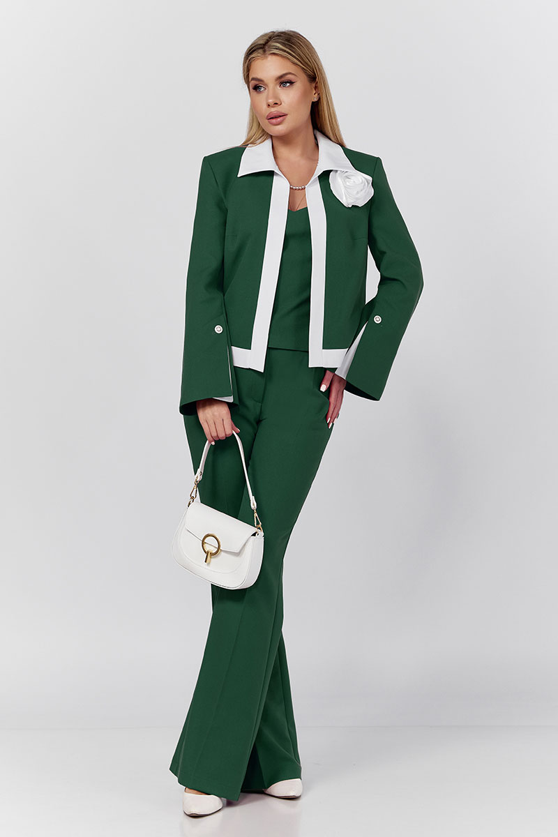 Жакет "BLAZER" без застежки на подкладке, рукав втачной расширенный к низу с декоративной шлицей. Изящность комплекту придает контрастная отделка воротника, планок, разреза шлицы и съемного декоративного цветка ручной работы подчеркнет вашу неотразимость и безупречный вкус.