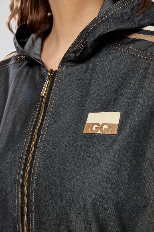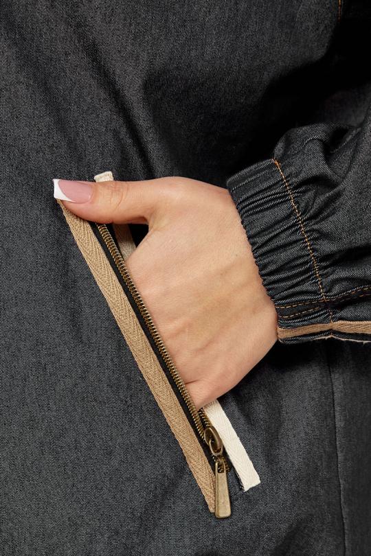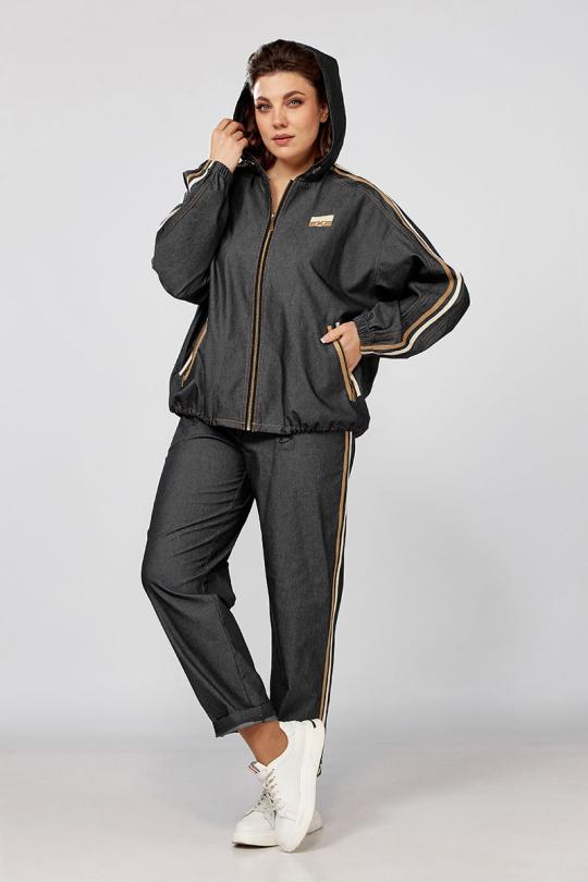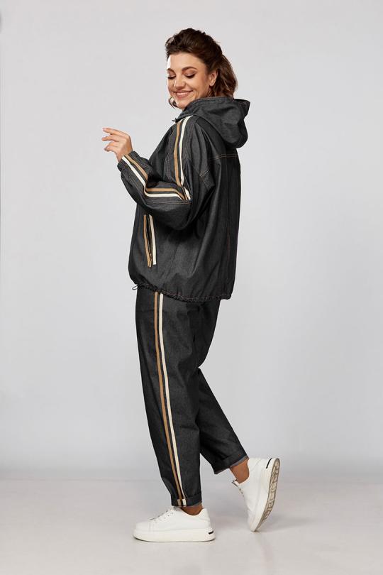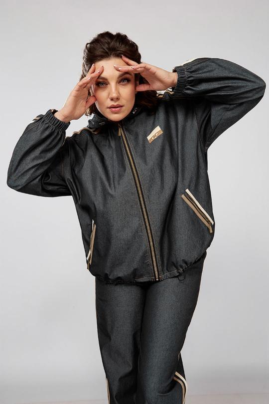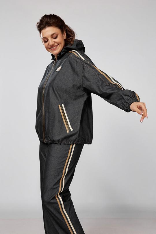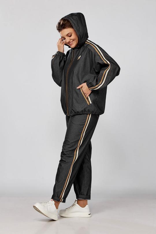 Куртка ветровка с капюшоном, свободного силуэта, прорезные карманы на замках. Рукава и брюки декорированы тесьмой, что значительно придает стройности вашему силуэту, низ ветровки регулируется кулисой.