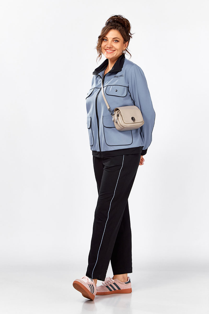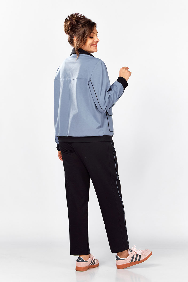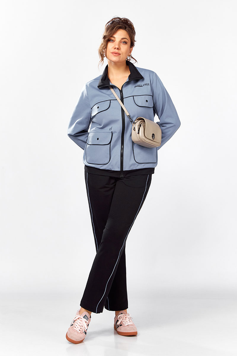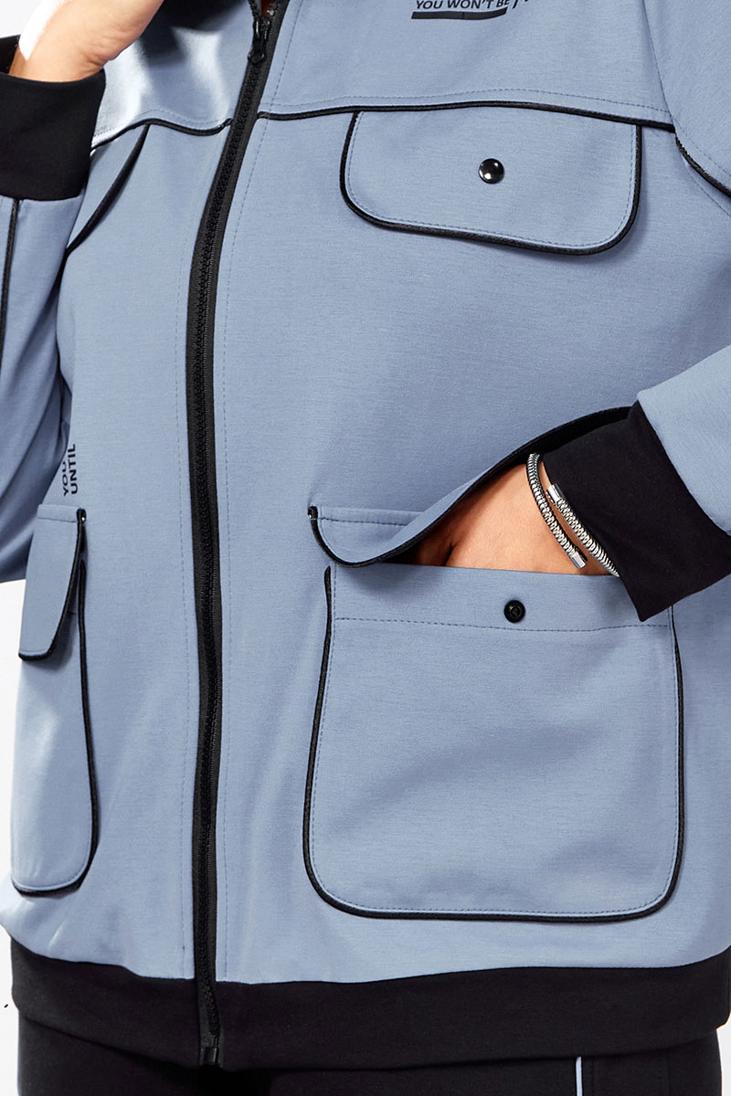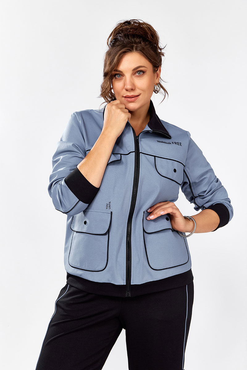 Джемпер свободного силуэта на молнии, воротник отложная стойка.  Накладные карманы, клапаны, кокетка и рукава декорированы отделаны контрастным черным кантом, в цвет брюк.