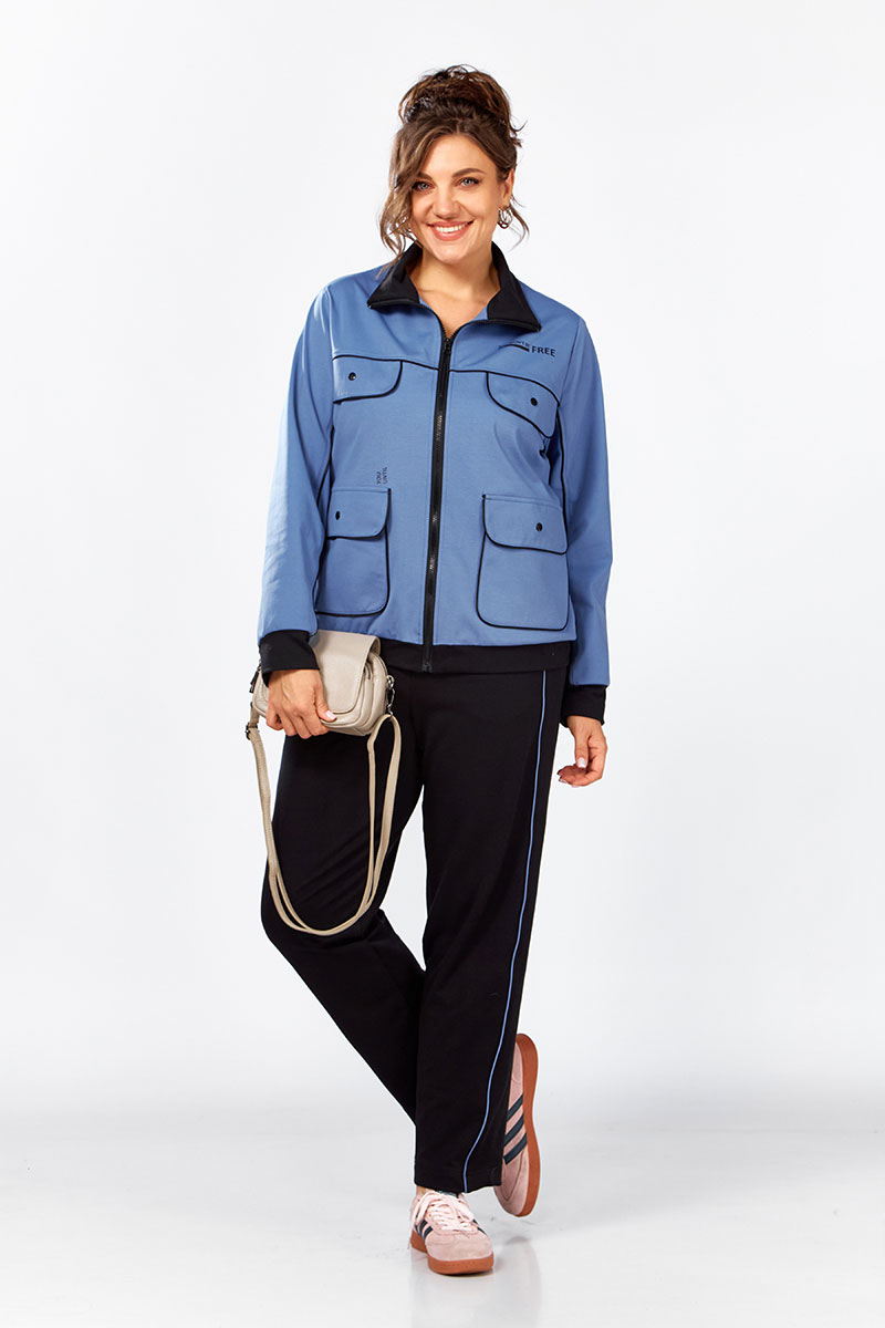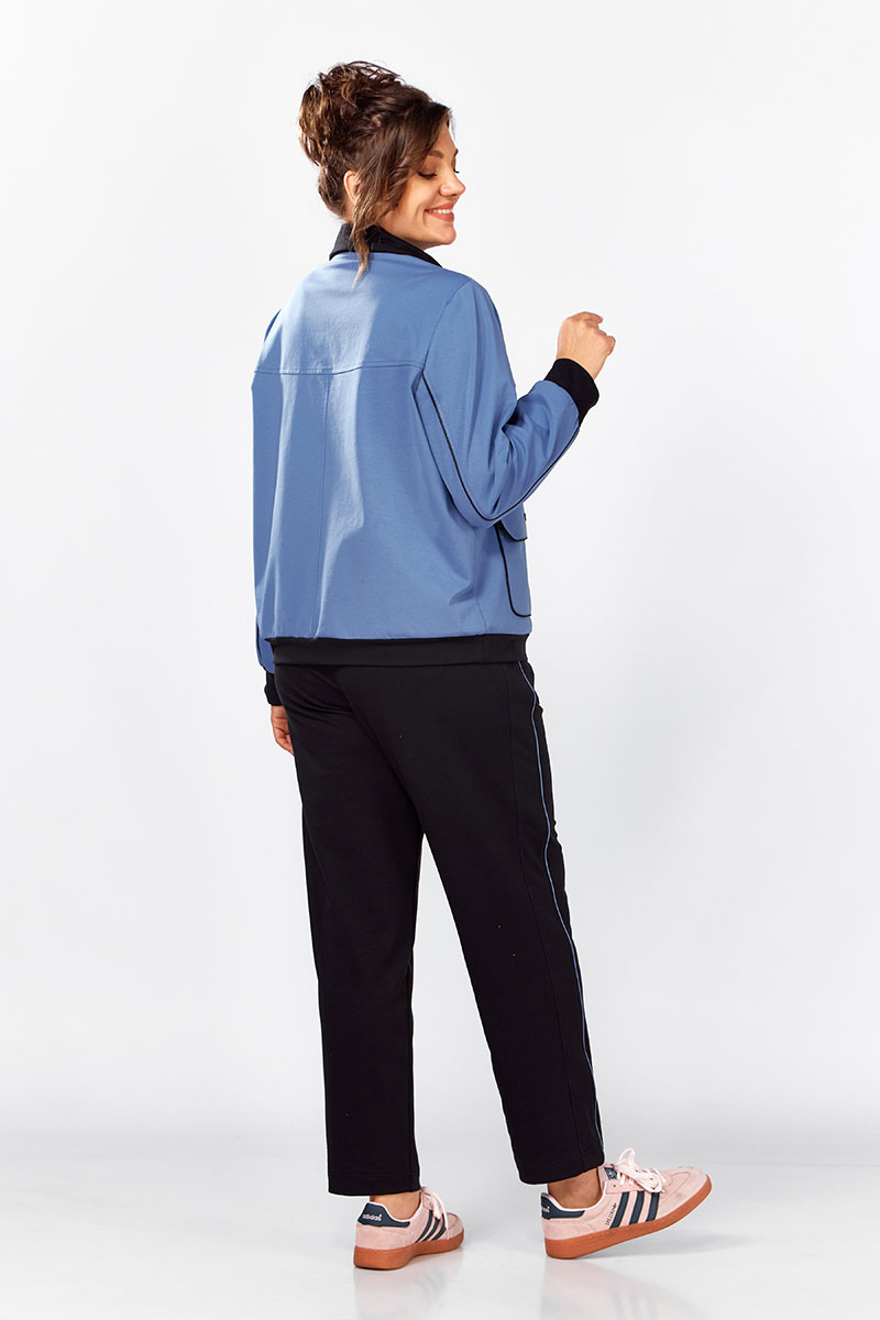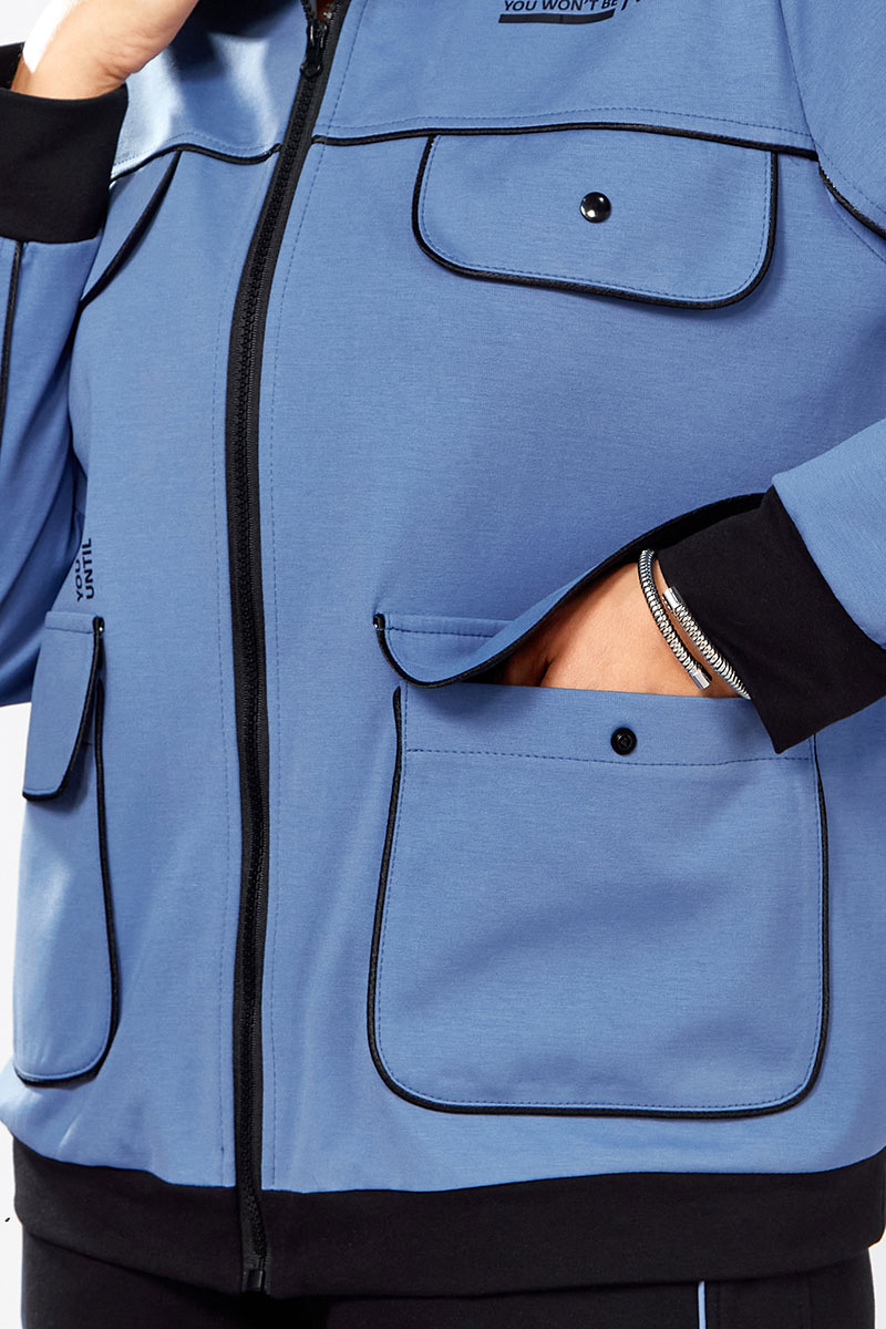 Джемпер свободного силуэта на молнии, воротник отложная стойка. Накладные карманы, клапаны, кокетка и рукава декорированы отделаны контрастным черным кантом, в цвет брюк.