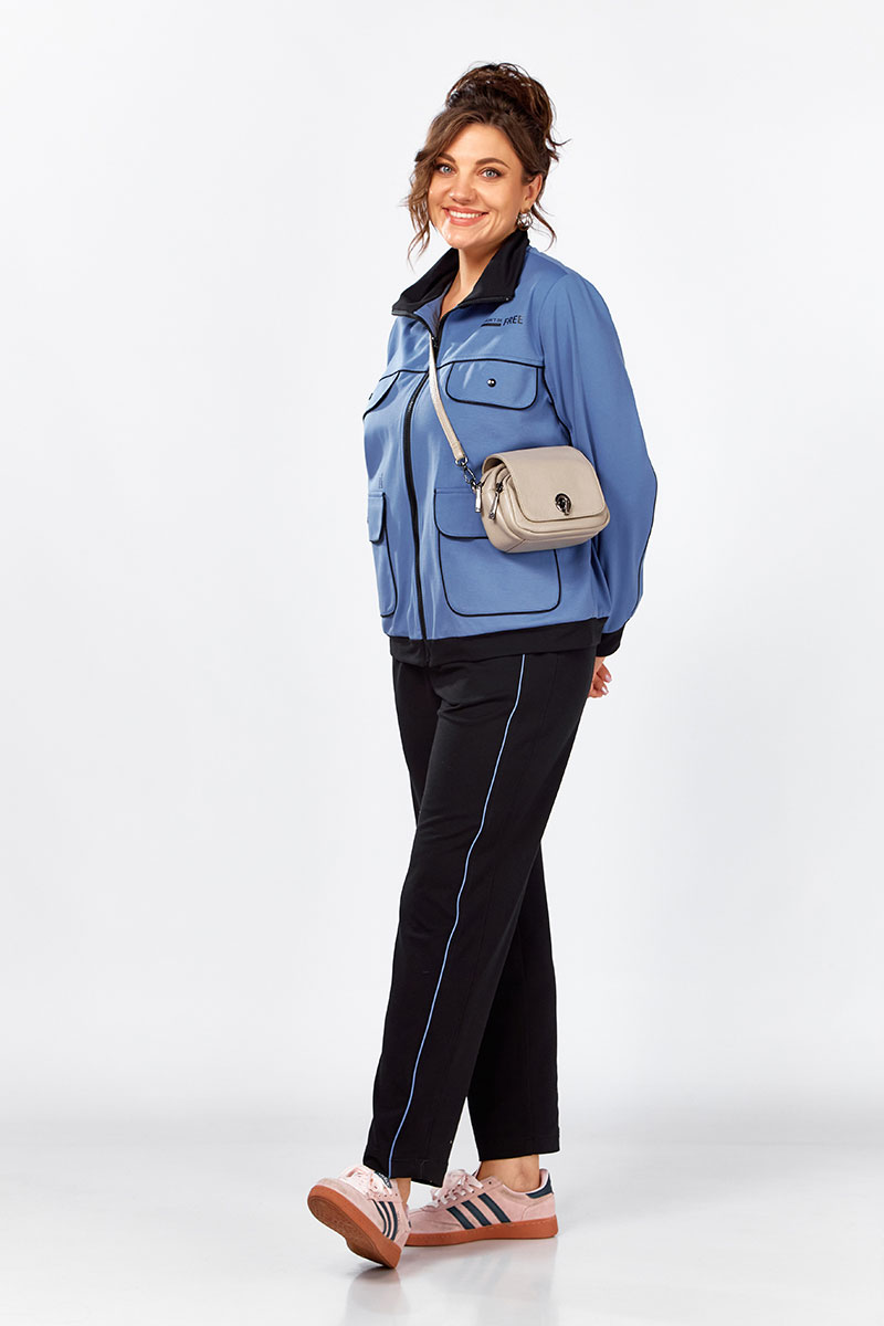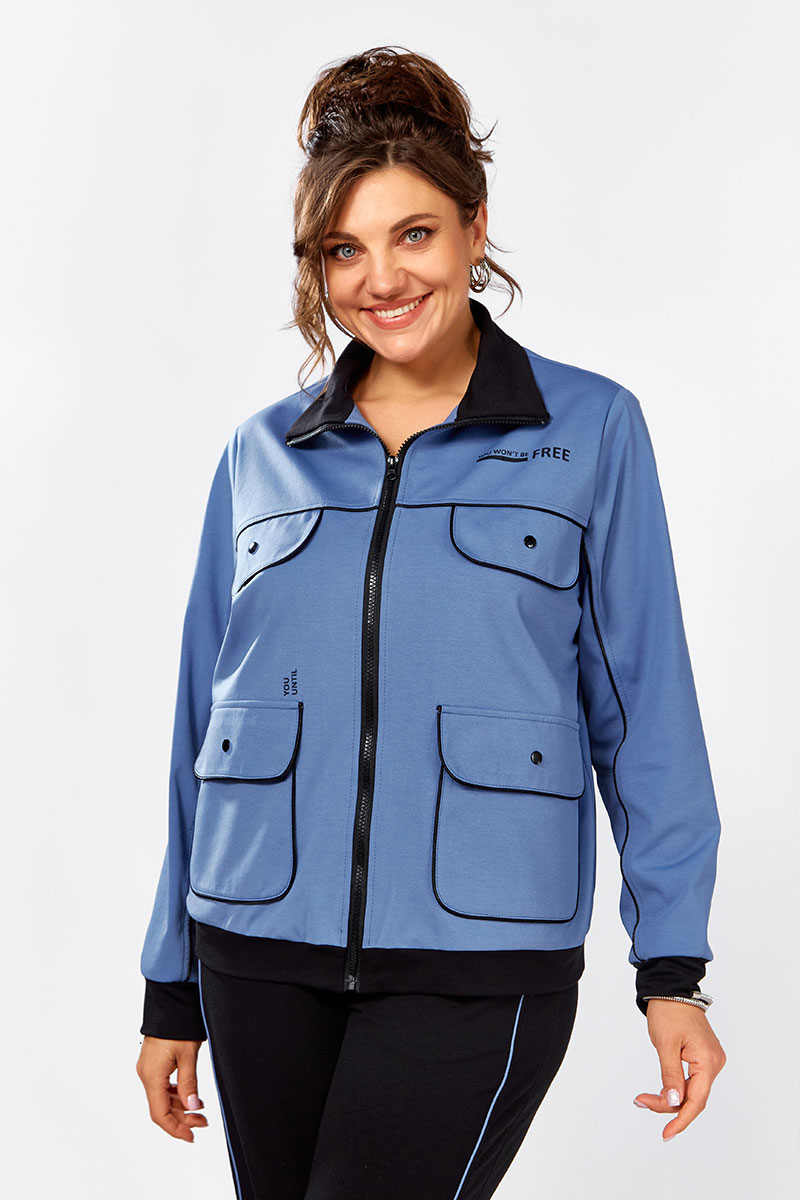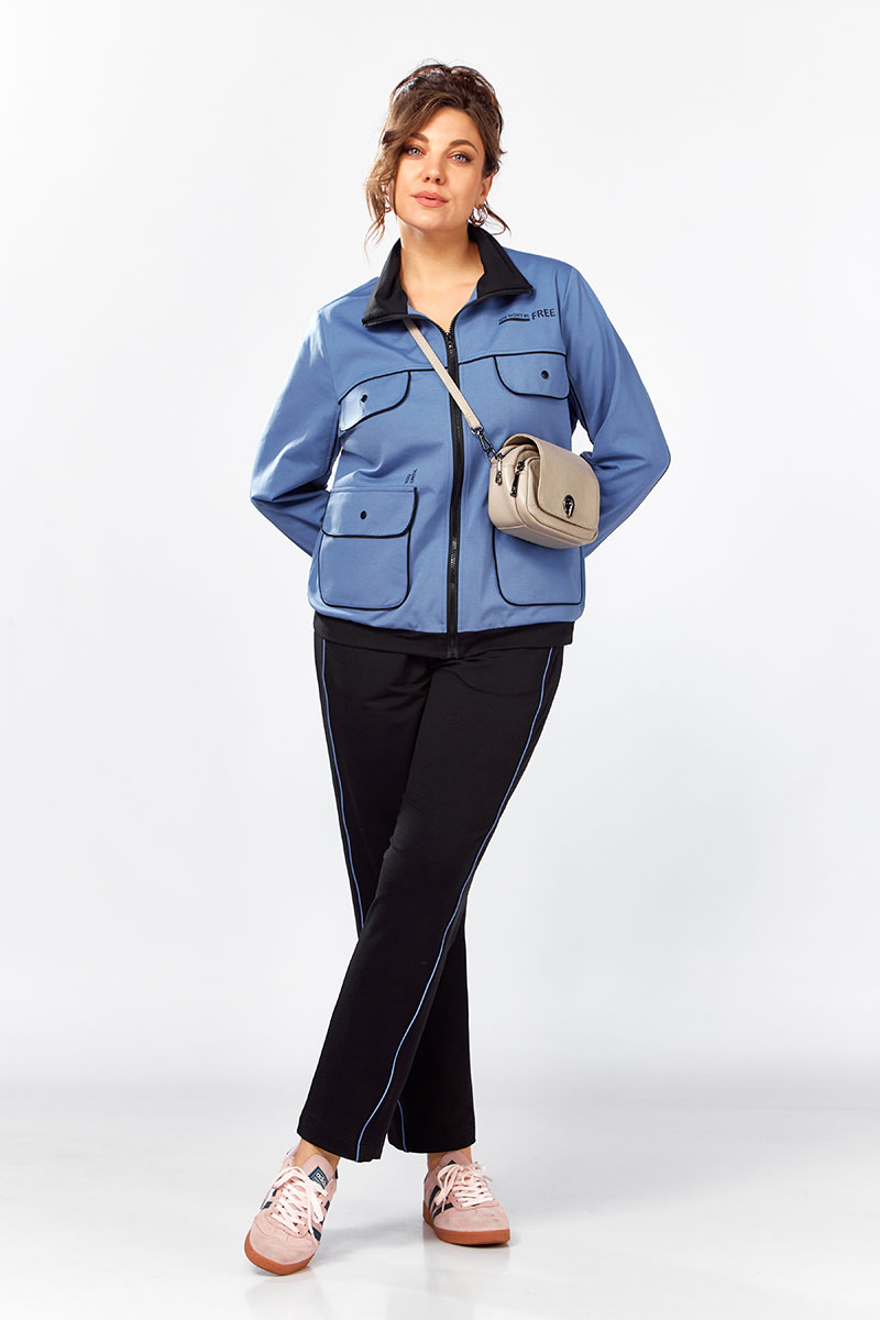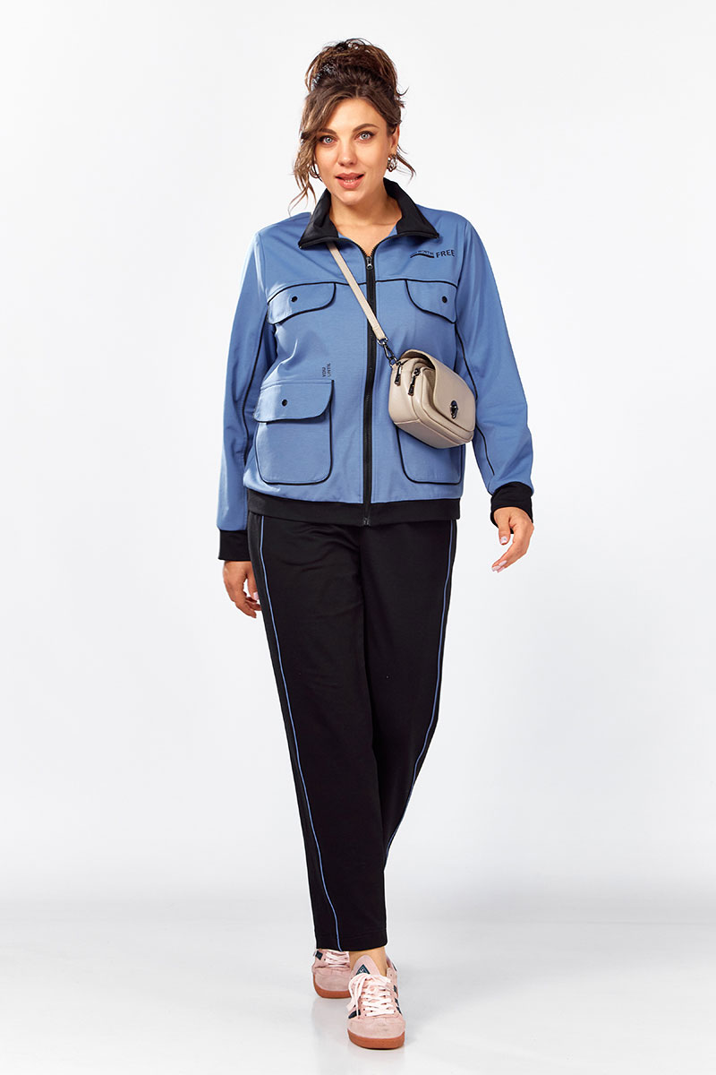 Джемпер свободного силуэта на молнии, воротник отложная стойка. Накладные карманы, клапаны, кокетка и рукава декорированы отделаны контрастным черным кантом, в цвет брюк.