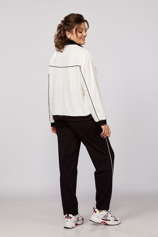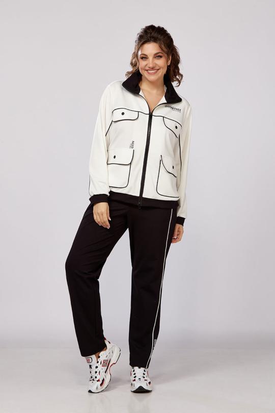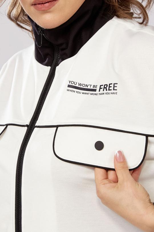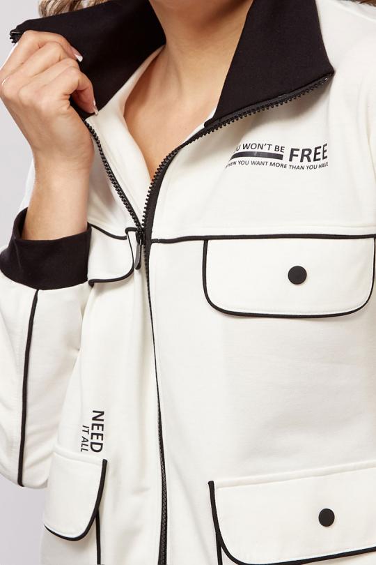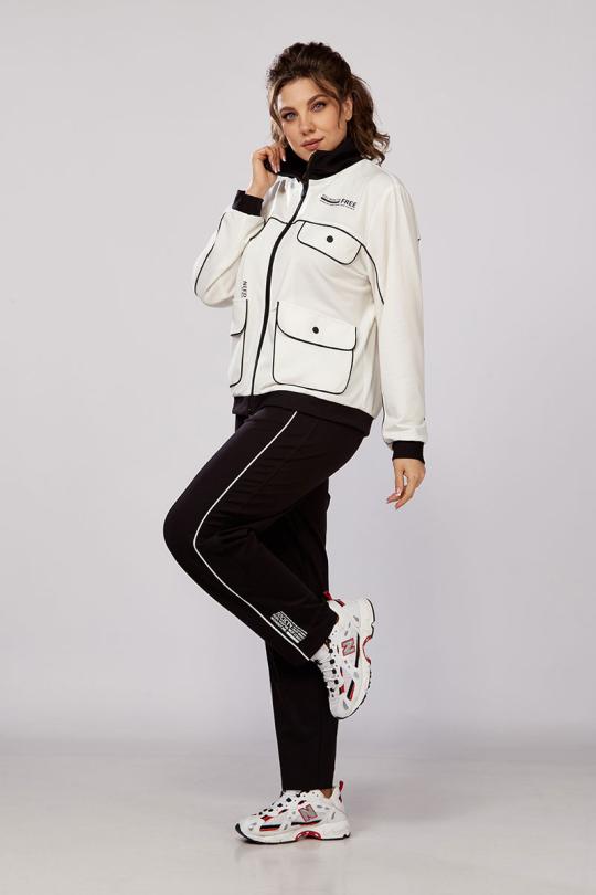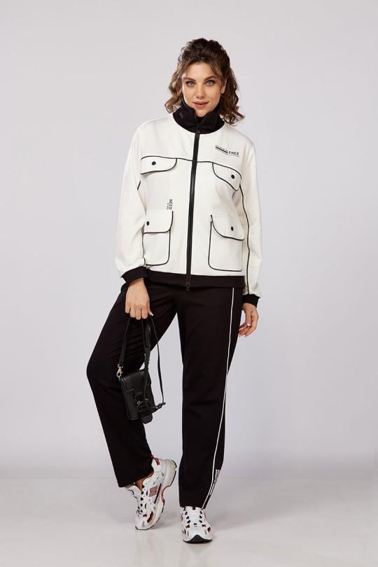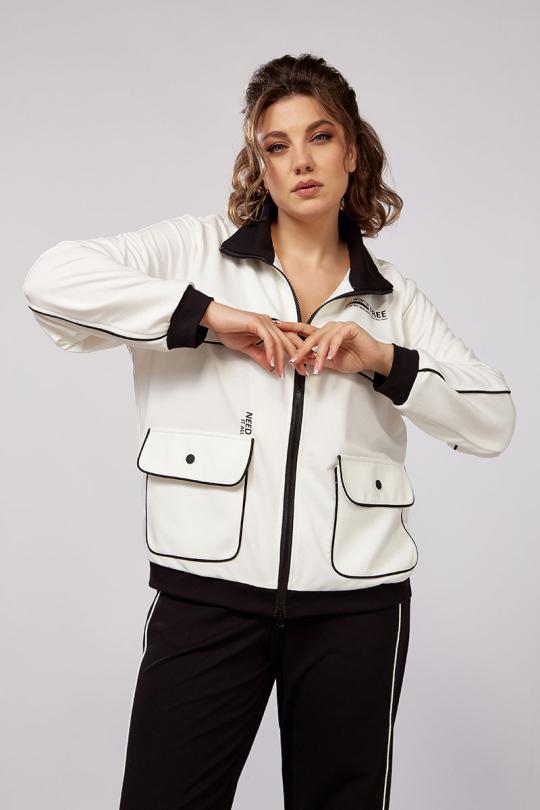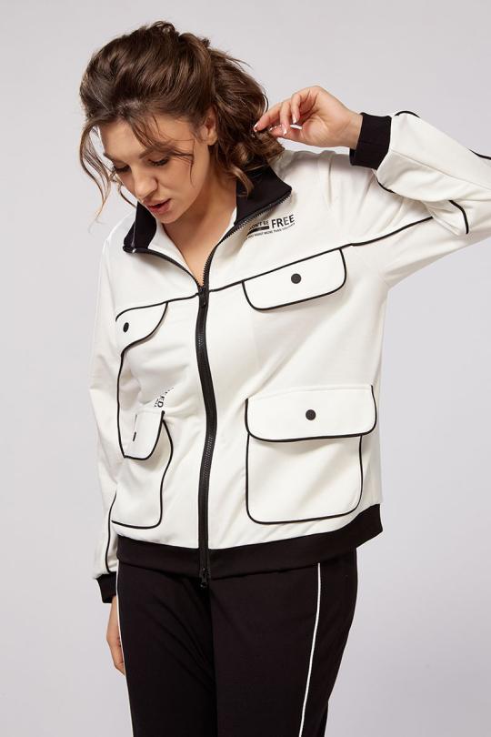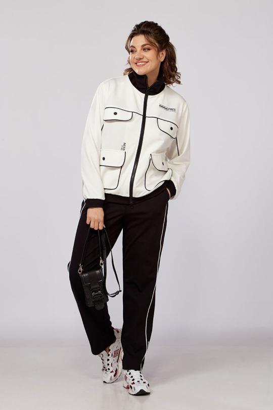 Бомбер свободного силуэта на молнии, воротник отложная стойка. Накладные карманы, клапаны, кокетка и рукава декорированы отделаны контрастным черным кантом, в цвет брюк.