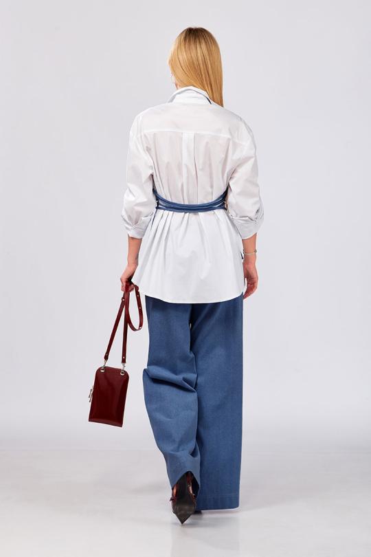 Блузка с отложным воротником и имитацией корсета, с возможностью стилизации за счет шнура и трех петель, расположенных в боровых швах на линии талии с каждой стороны. Рукав длинный,