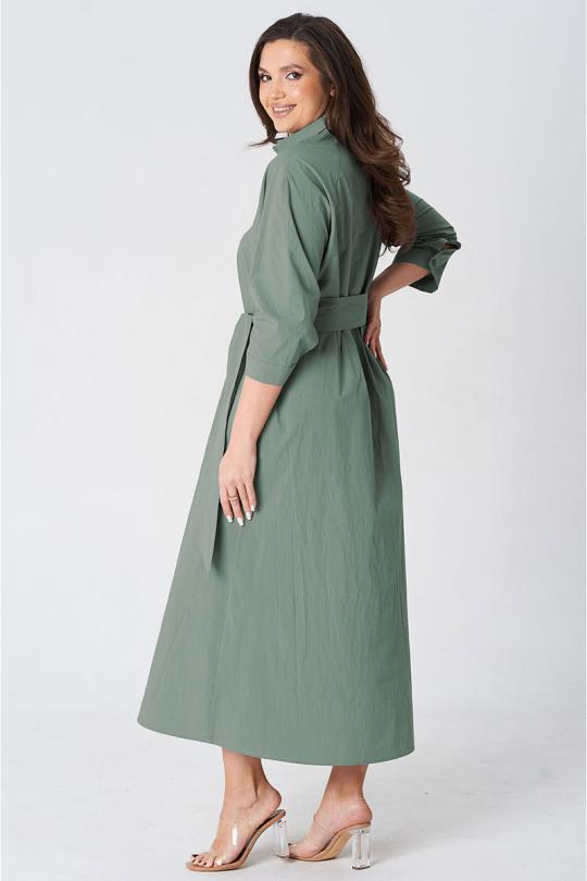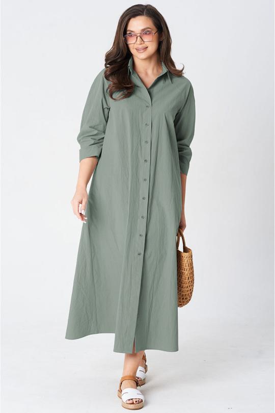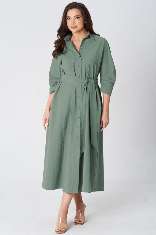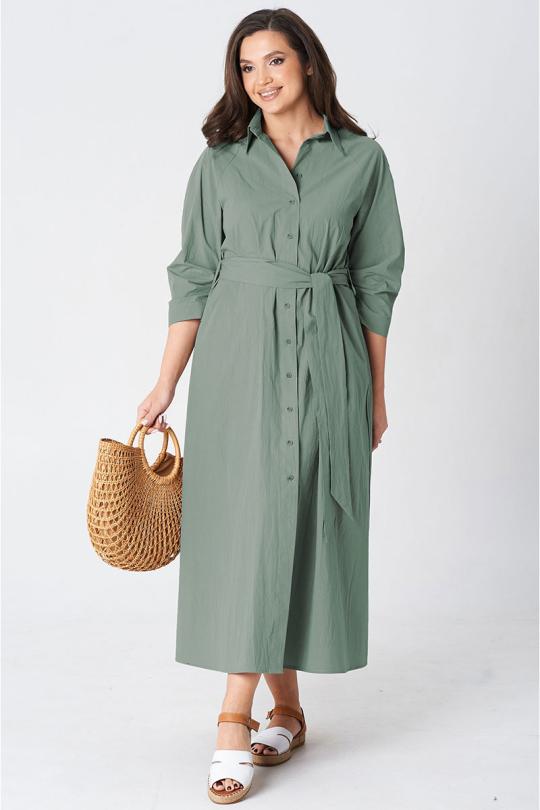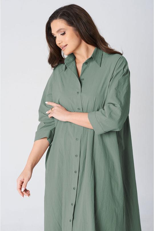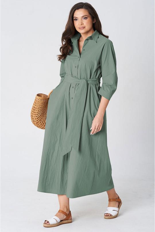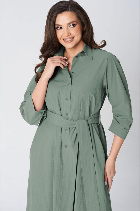 Платье покроя реглан, свободного силуэта, расширенное к низу. Застежка центральная бортовая на петли и пуговицы. Воротник рубашечный с отрезной стойкой. Рукав длиной ниже линии локтя на манжете застегивающейся на петлю и пуговицу. В боковых швах платья карманы. В комплект входит пояс из основной ткани.