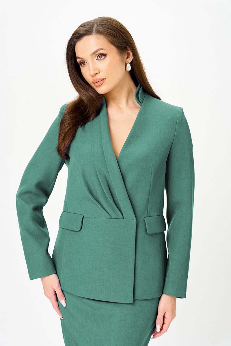 Жакет полуприлегающего силуэта на подкладке. По переду отрезные бочки, функциональные прорезные карманы с клапаном и асимметричный декоративный элемент в виде трёх мягких складок выходящих из подреза по талии по правой стороне переда, переходящий в двойной воротник-стойку по левой стороне переда. Спинка со средним швом и рельефами из проймы. Рукав длинный, втачной, двухшовный.