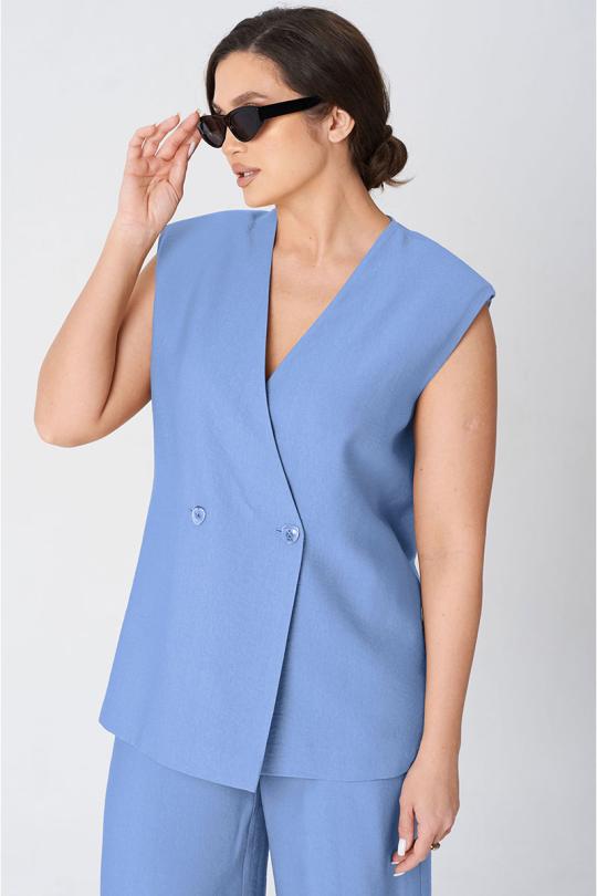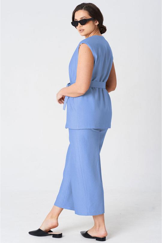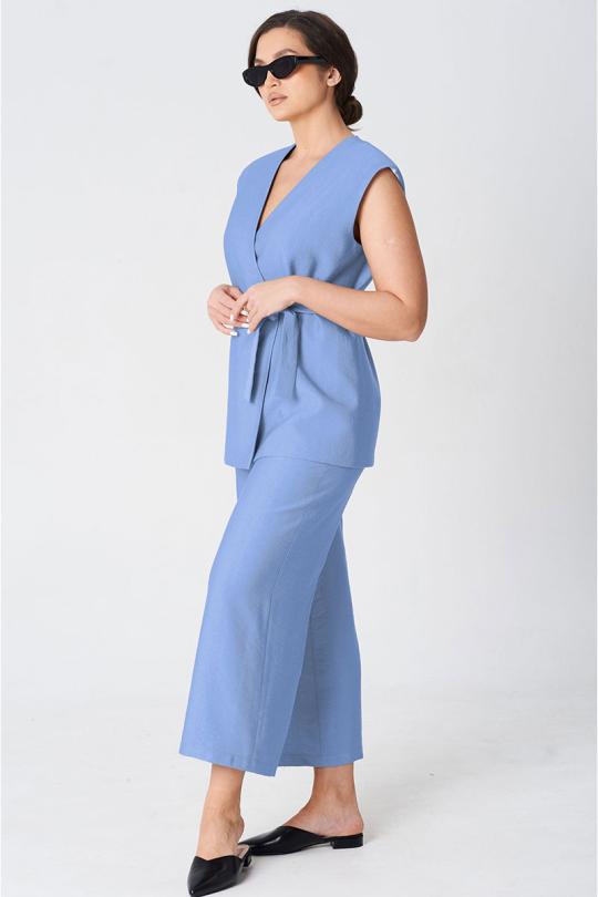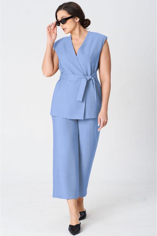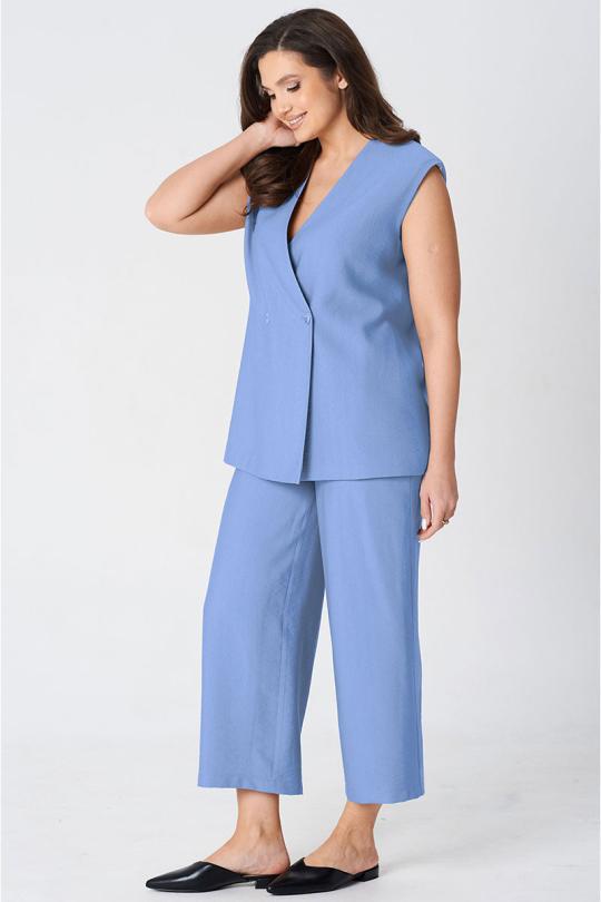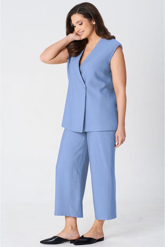 Комплект состоящий из жилета и укороченных брюк (кюлоты) Жилет на подкладке, прямого силуэта с увеличенной плечевой накладкой. Застежка двубортная на 2 петли и пуговицы. В комплект входит мягкий пояс из основной ткани. Брюки прямого покроя на прямом поясе с резинкой по спинке. Застежка на тесьму-молнию и пуговицу. По передним половинкам брюк функциональные карманы.
