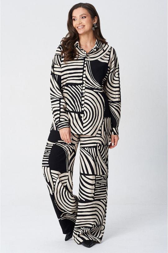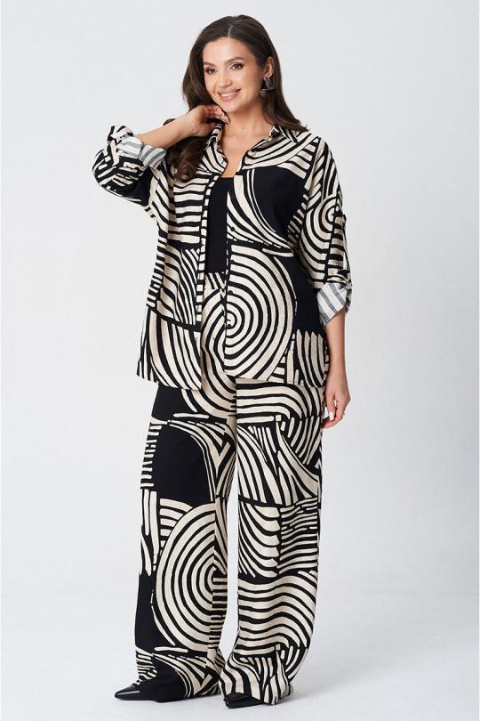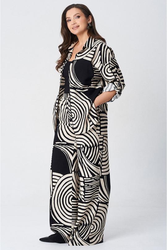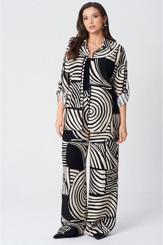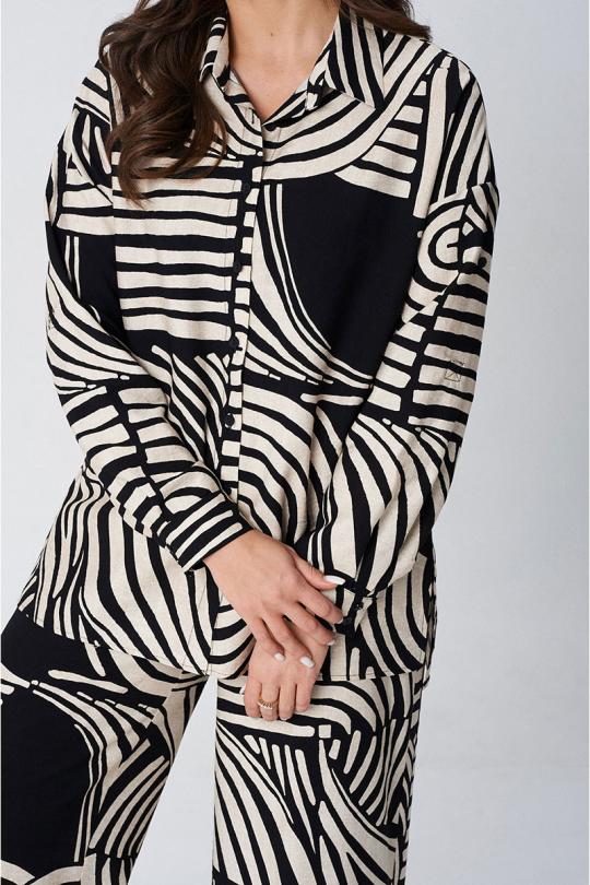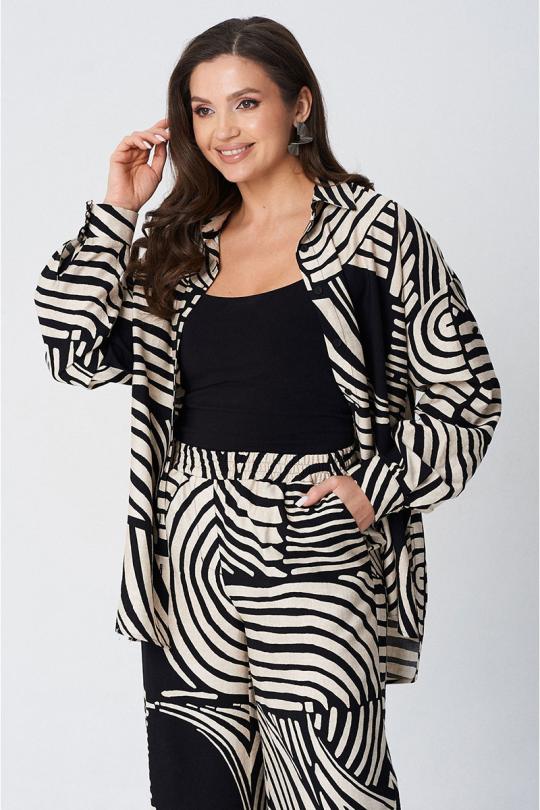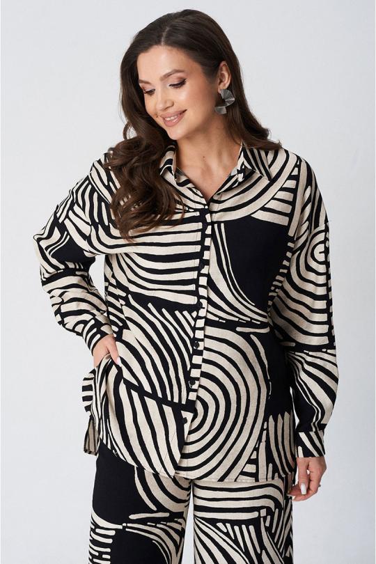 Блузка свободного силуэта со спущенной линией плеча. По спинке кокетка. Рукав одношовный, длинный с притачной манжетой застегивающаяся на петлю и пуговицу, длина рукава регулируется за счет паты. Воротник рубашечный с отрезной стойкой. Застежка центральная бортовая на петли и пуговицы. Низ изделия асимметричный, в боковых швах разрезы.