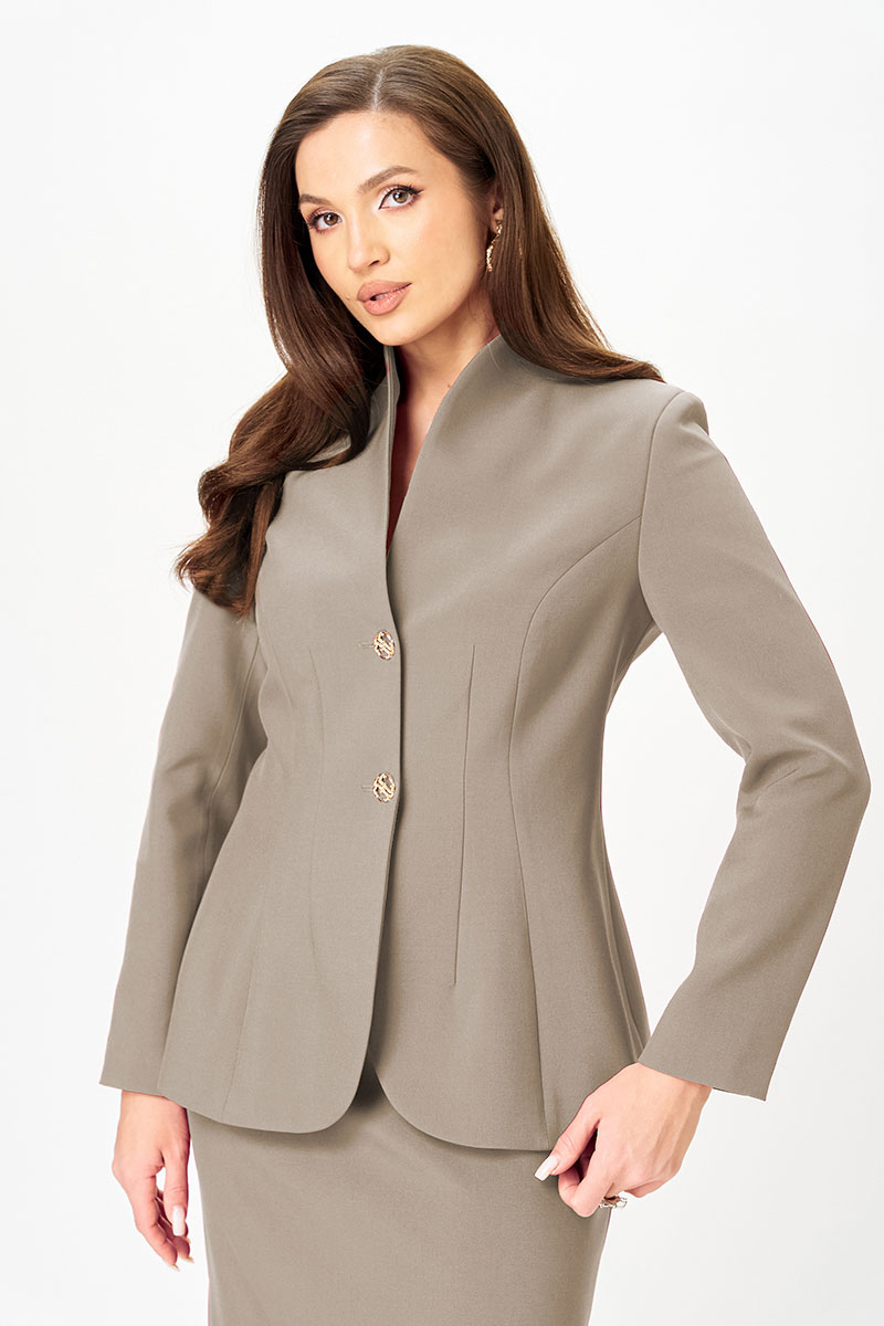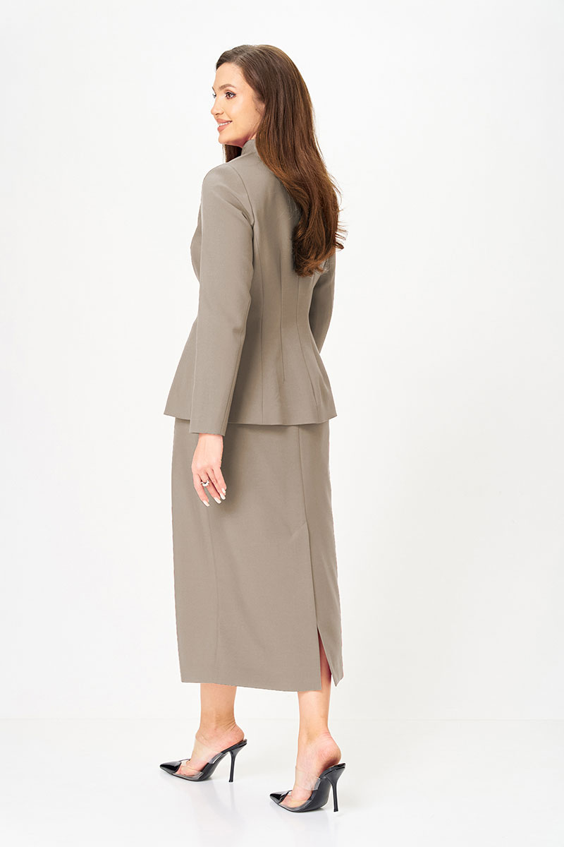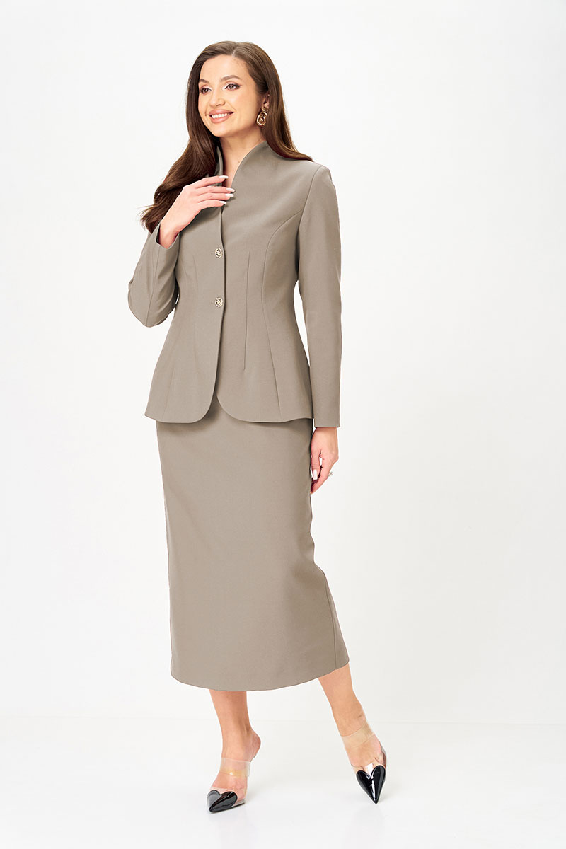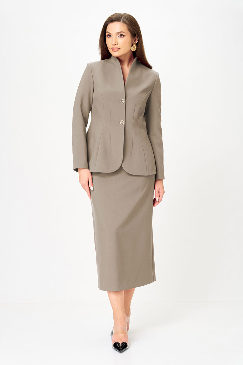 Комплект состоит из жакета и юбки и изготовлен из костюмной ткани. Жакет приталенный, на подкладке, с цельнокроеной стойкой. По спинке средний шов и талиевые выточки. Вырез V-образный, переходящий в цельнокроеную стойку, рукав втачной, двухшовный. Застёжка на декоративные пуговицы ( в р. 44-48- 2 пуговицы, в р. 50-54 – 3 пуговицы). Юбка прямого силуэта длиной миди на подкладке. По заднему полотнищу средний шов и шлица. Юбка на притачном фигурном поясе. Застежка на потайную тесьму-молнию в среднем шве заднего полотнища юбки. Этот стильный юбочный костюм ассоциируется с изяществом, аристократизмом и утонченностью. Элегантный стиль, позволяющий женщинам любого возраста оставаться обаятельными и женственными, будет актуален всегда.