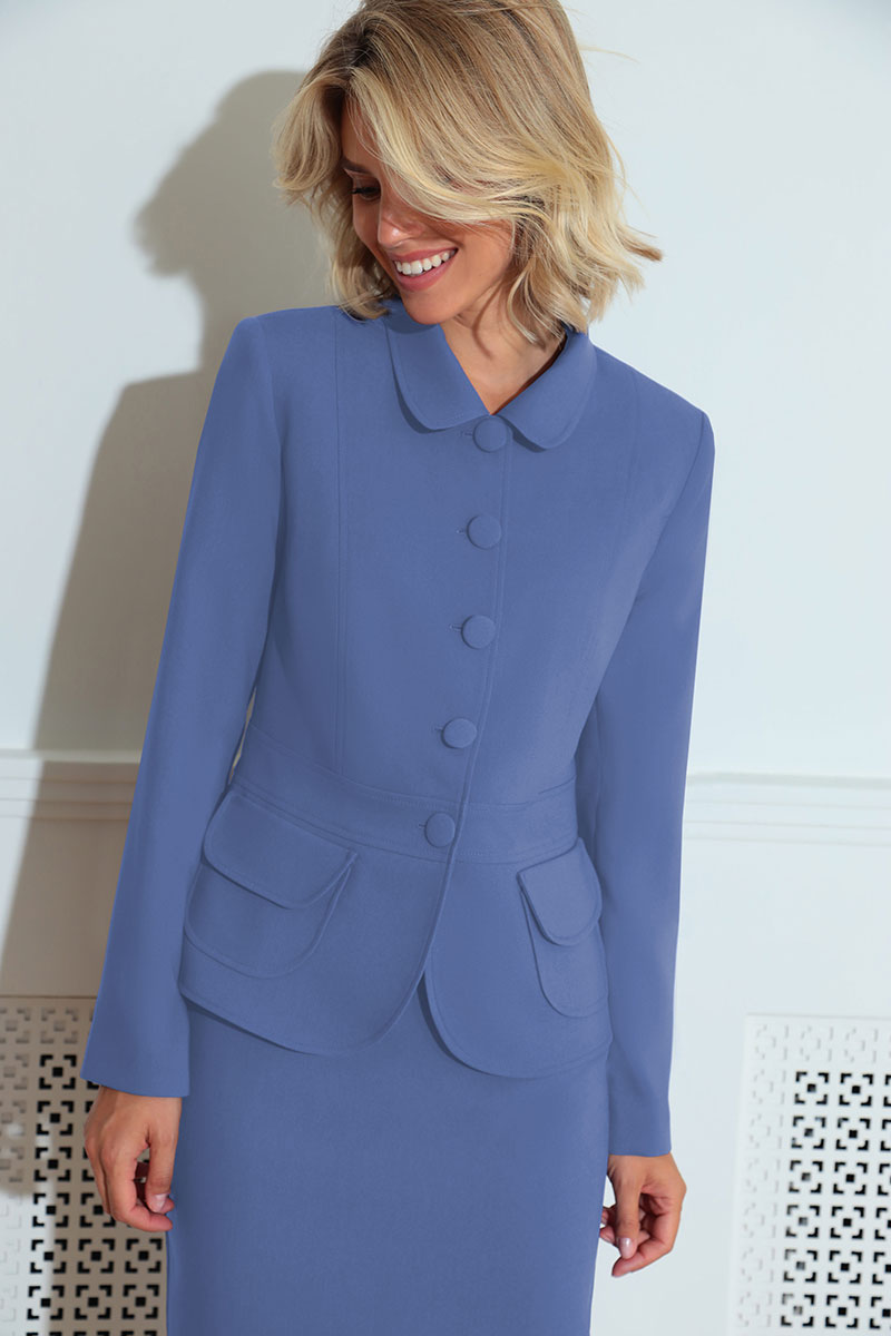 Жакет полуприлегающего силуэта на подкладке с рельефами по переду и спинке, с отрезным поясом по талии и накладными карманами с клапаном. Рукав втачной двухшовный длинный, воротник стояче-отложной. Застежка центральная бортовая на обтяжные пуговицы.