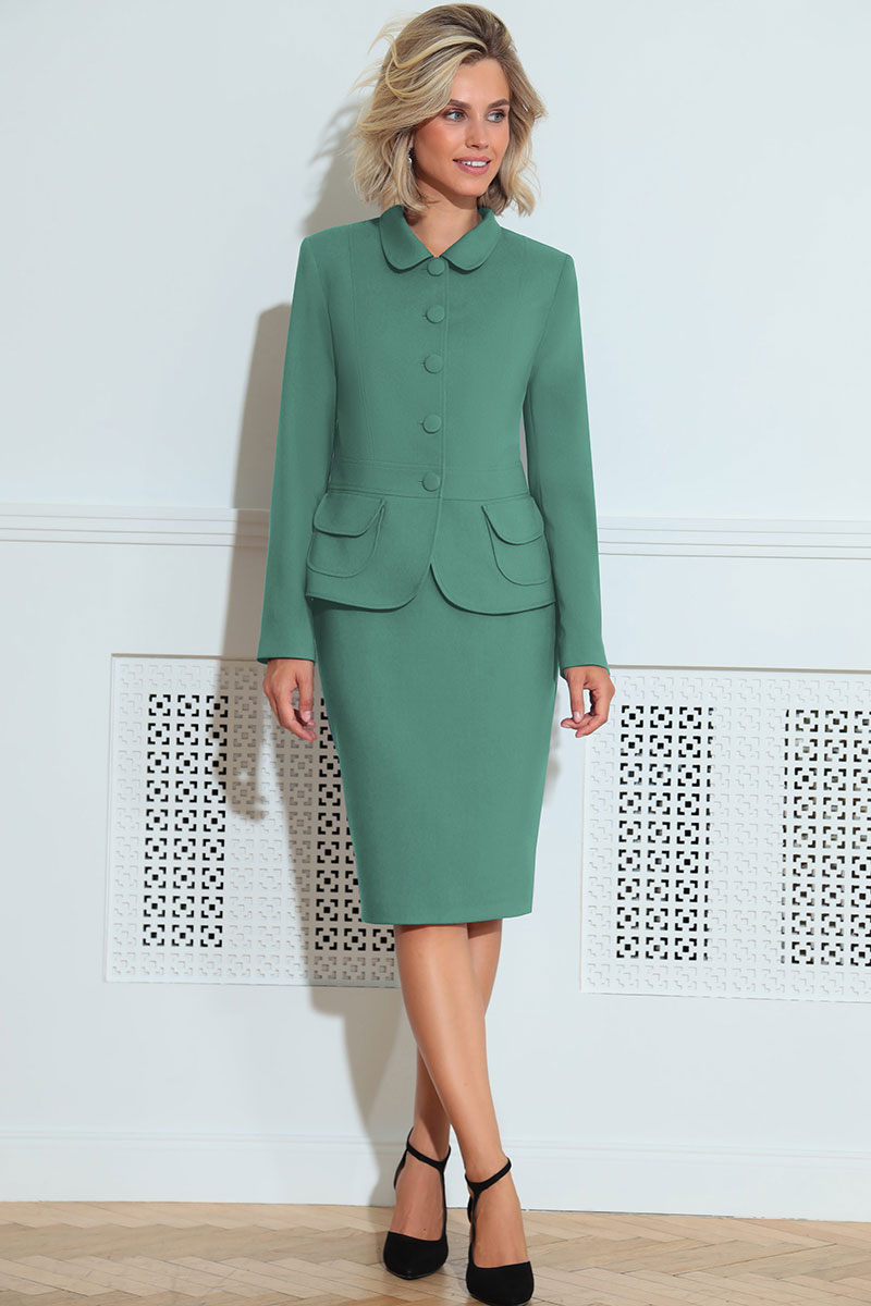 Жакет полуприлегающего силуэта на подкладке с рельефами по переду и спинке, с отрезным поясом по талии и накладными карманами с клапаном. Рукав втачной двухшовный длинный, воротник стояче-отложной. Застежка центральная бортовая на обтяжные пуговицы.