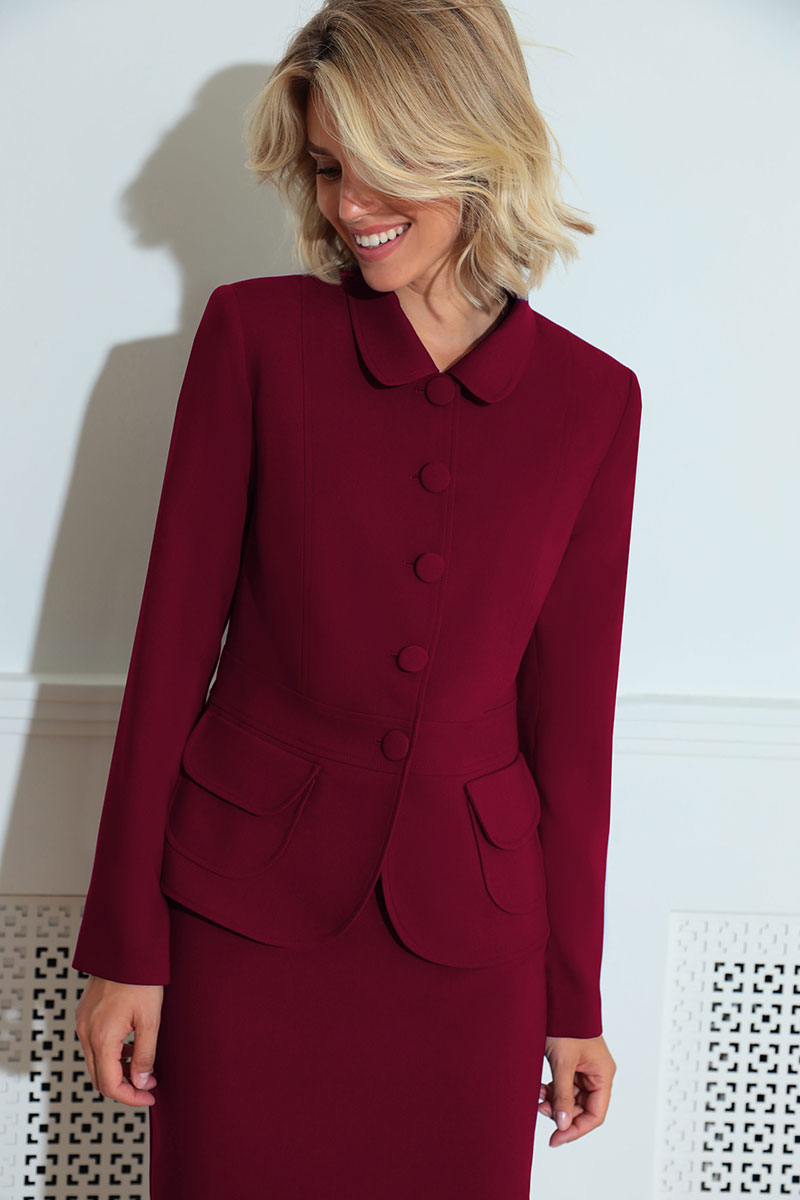 Жакет полуприлегающего силуэта на подкладке с рельефами по переду и спинке, с отрезным поясом по талии и накладными карманами с клапаном. Рукав втачной двухшовный длинный, воротник стояче-отложной. Застежка центральная бортовая на обтяжные пуговицы.