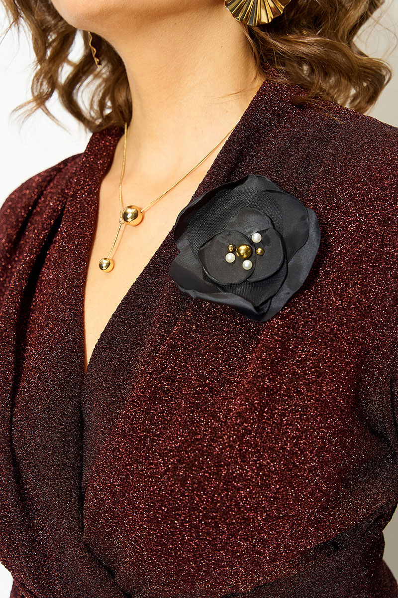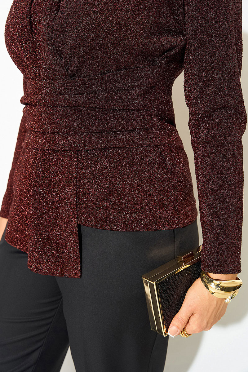 Эффектная нарядная блузка, выполнена из мягкого трикотажа с мерцающим эффектом. Такой дизайн ткани придает необычное переплетение нитей: с изнанки мягкий однотонный трикотаж! Вырез горловины мягкая стойка, переходящая в V-образный вырез с имитацией запаха. По полочке заложены декоративные складки для комфортного прилегания изделия. Низ блузки ассиметричный. Пояс декорирован задрапированным поясом из основной ткани, что зрительно стройнит и скрывает все недостатки фигуры. Рукав в точной, длинный. Спинка приталенная, без особенностей. К блузке предусмотрен съемная брошь, в виде цветка. Отлично сочетается с базовыми однотонными брюками из коллекции Лилиана.