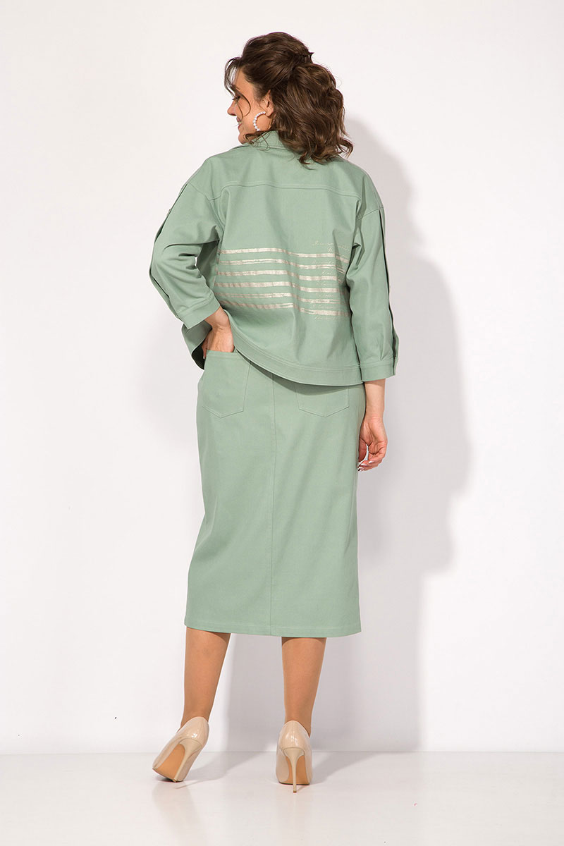 В комплекте юбка-карандаш зауженная к низу, длиной за колено. Модель с пикантным разрезом по переду. Застежка на металлическую молнию с обработанным гульфиком. Пояс притачной, в боковых участках вставлена резинка. По спинке расположены накладные карманы. Юбка без подкладки выполнена из джинсовой ткани.
