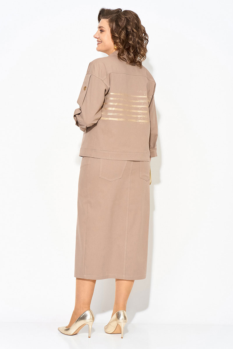 В комплекте юбка-карандаш зауженная к низу, длиной за колено. Модель с пикантным разрезом по переду. Застежка на металлическую молнию с обработанным гульфиком. Пояс притачной, в боковых участках вставлена резинка. По спинке расположены накладные карманы. Юбка без подкладки выполнена из джинсовой ткани.