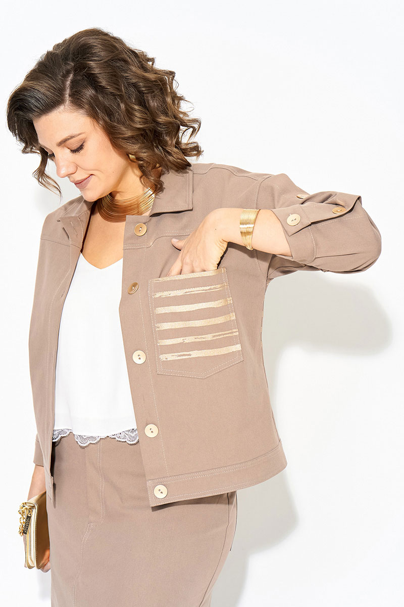 Жакет свободного силуэта, выполнен их хлопка под Джинс. Воротник отложной; застежка центральная на петли и пуговицы. Рукав со спущенным плечевым поясом, длиной ¾-ти на притачной манжете. По центру рукава расположена декоративная застежка на петли и пуговицы. Перед с кокеткой, с ассиметричным накладным карманом. Спинка повторяет дизайн полочки. По спинке расположена ассиметричная печать в виде полоски!