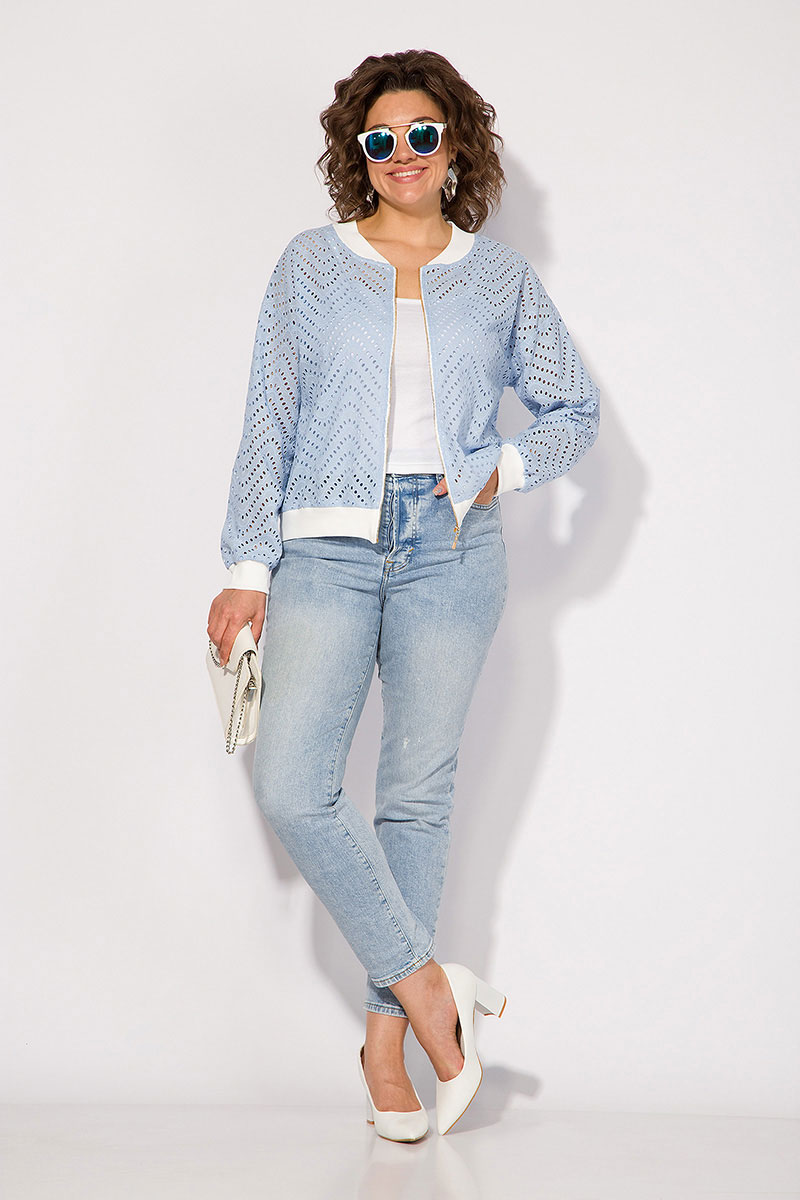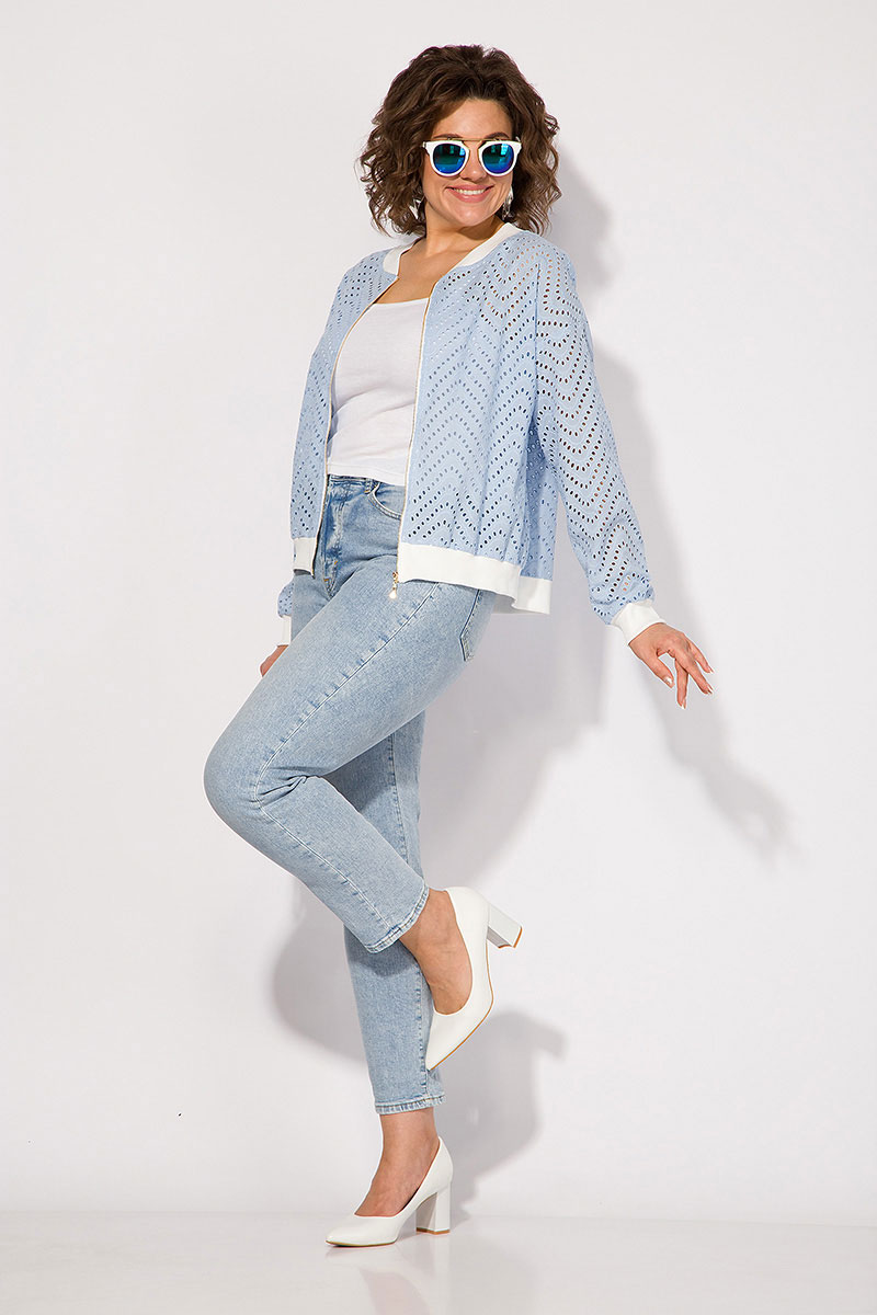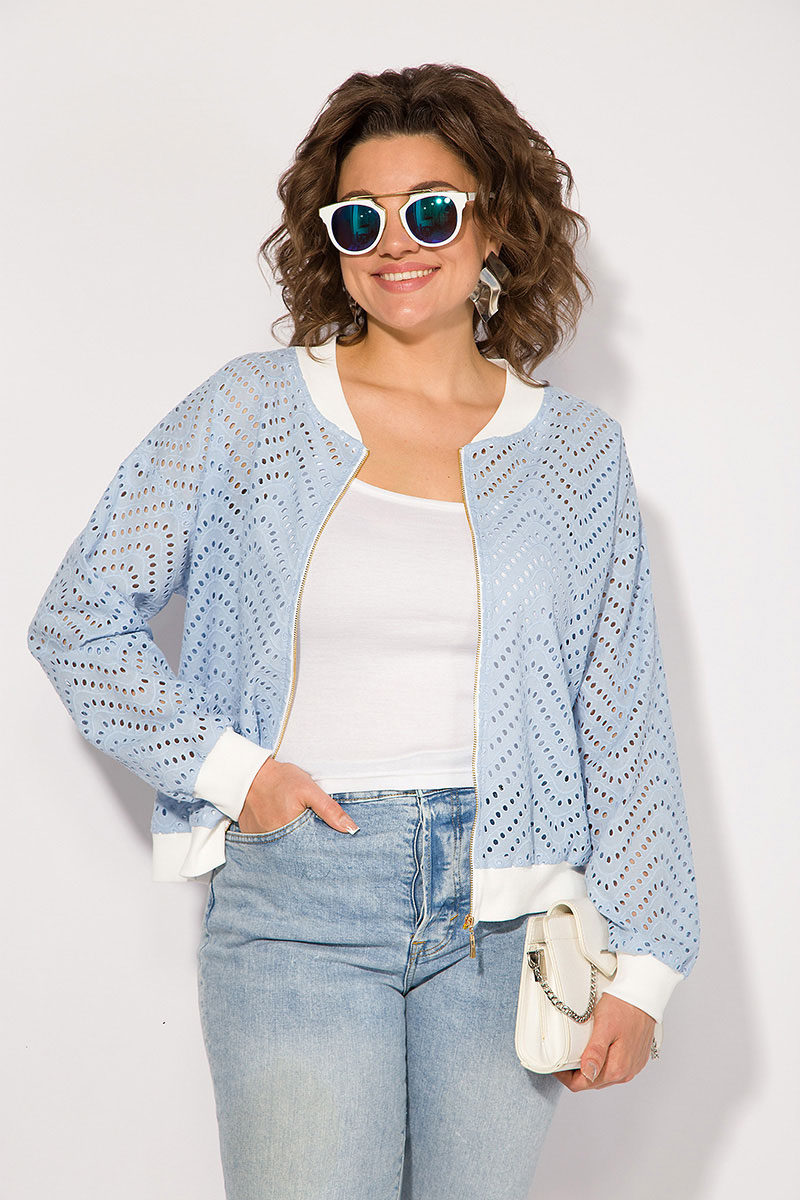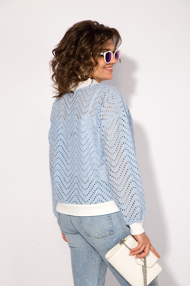 Жакет по типу бомбера с застежкой на металлическую молнию, выполнен из хлопковой ткани с вышивкой ришелье. Рукав на спущенном плечевом поясе. Вырез горловины, низ изделия и рукавов оформлен мягкой притачной планкой из кашкорсе. Спинка без особенностей.
