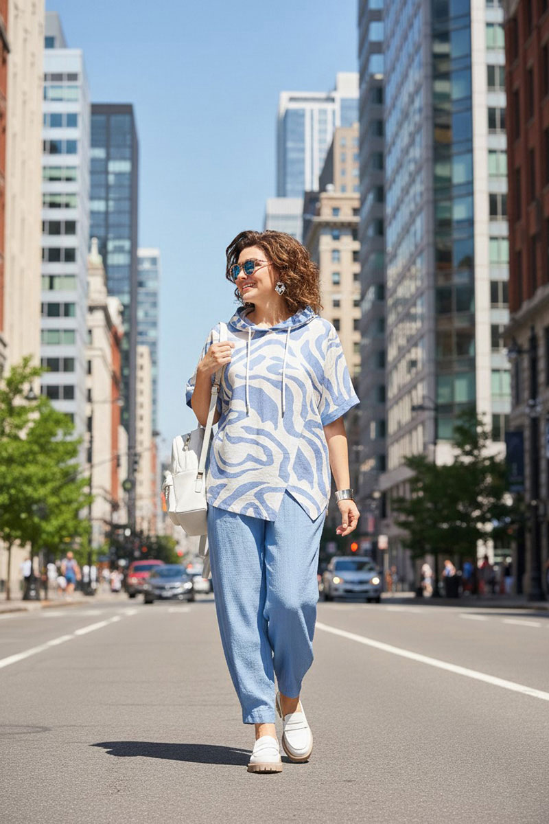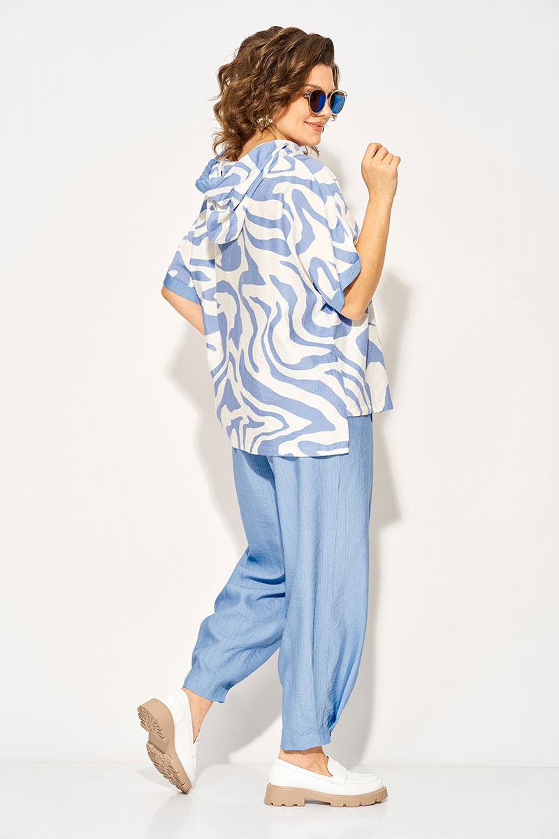 Стильный летний костюм, состоящий из удлиненной туники свободного покроя и брюк.