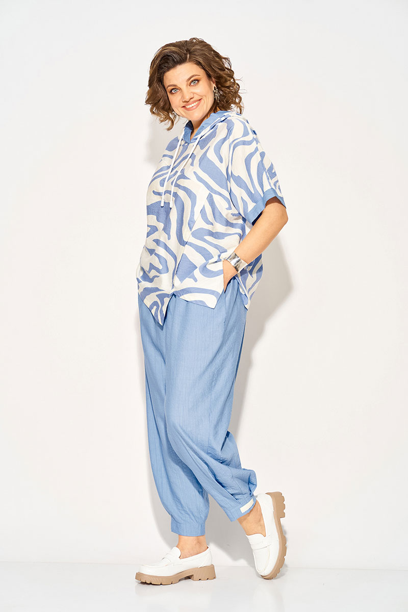 В комплекте свободные брючки, завышенной посадки. Брюки на притачном поясе с круговой резинкой. Имеются боковые карманы. Низ с заложенными складками, что придает изделию более спортивный образ.