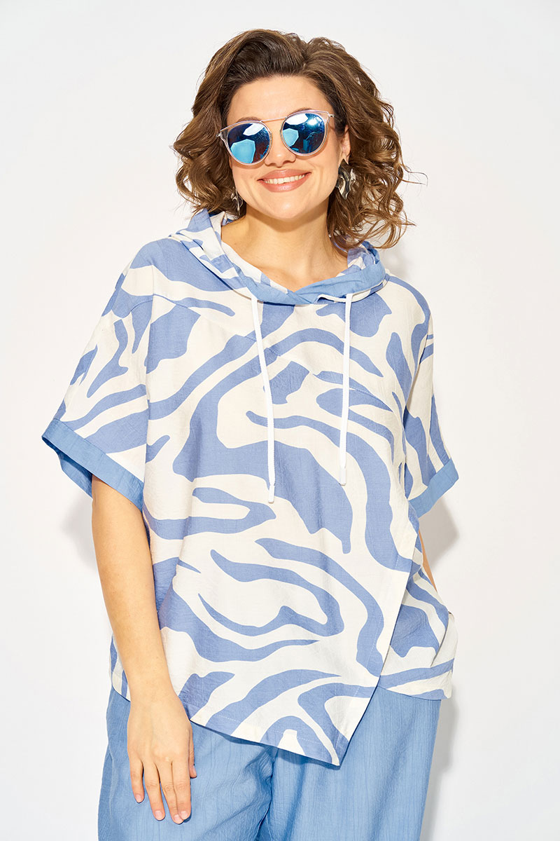 Оригинальная туника из вискозы добавлением льна. Модель с цельнокроеным укороченным рукавом и ассиметричным подрезом по полочке. Модель с легким капюшоном и кулисой на шнуровке. Низ изделия разноуровневый. Спинка цельная.