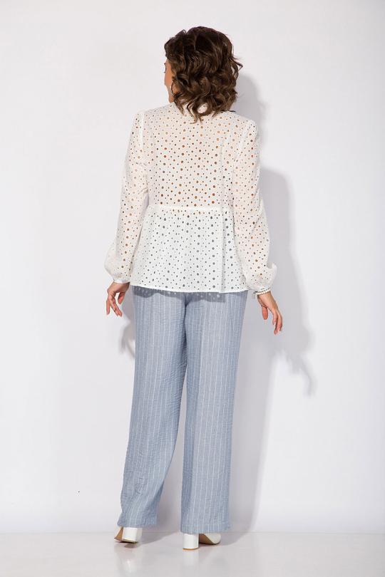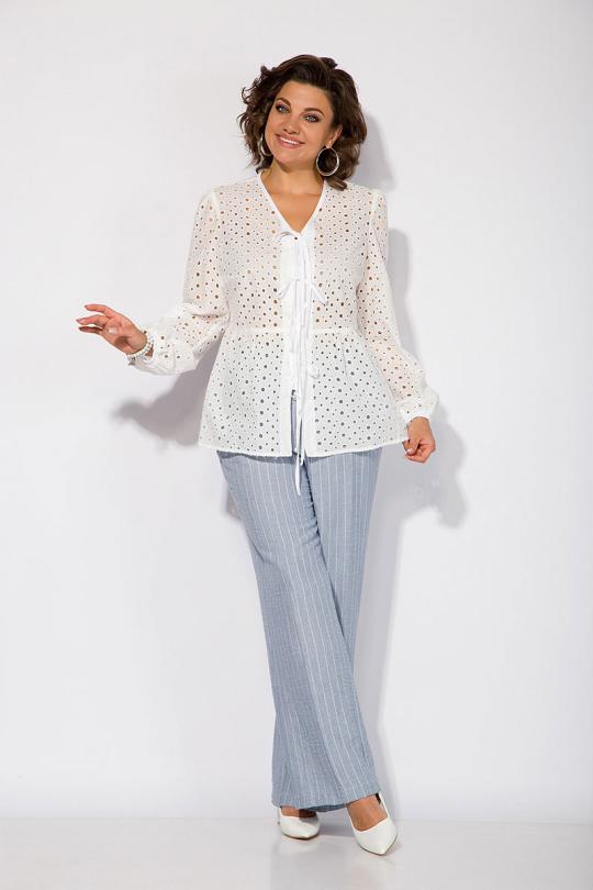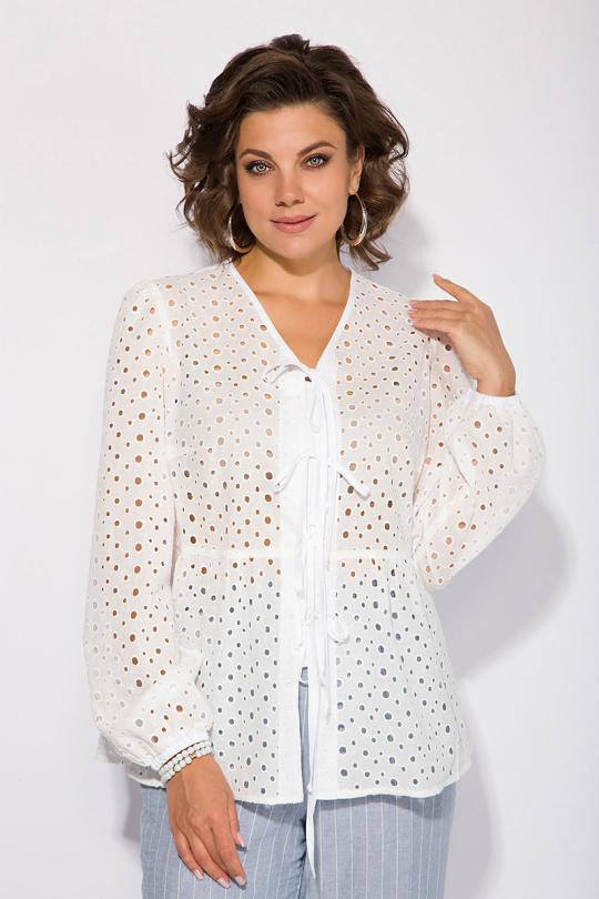 Романтическая женская блузка из 100% хлопка с вышивкой «ришелье». Модель с v-образным вырезом горловины, с застежкой встык на декоративную завязку. По линии талии блузка отрезная, с легкой сборкой по низу. Рукав вточной, полной длины, присборен по низу на резинку. Данная блузка оставит гармоничный комплект с однотонными брюками из базовой коллекции от бренда «Лилиана»!