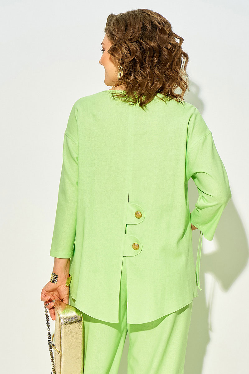 Блузка свободного силуэта, со спущенной линией плеча и рукавом длиной ¾-ти. Модель c V-образной линией горловины с центральной застежкой на петли и пуговицы. По центру рукава расположена кулиска с утяжкой на шнуровку. Спинка с центральным швом, переходящий в шлицу с декоративными клапанами на пуговицах.