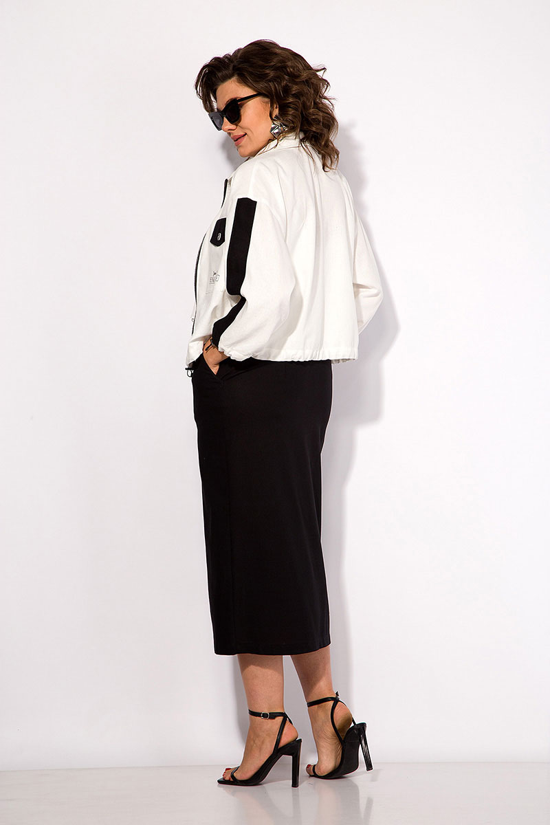 Юбка заужена к низу, на притачном поясе с застежкой на тесьму-молнию с обработанным гульфиком. В юбке предусмотрены боковые карманы, а также разрез по переду на свободу движения.