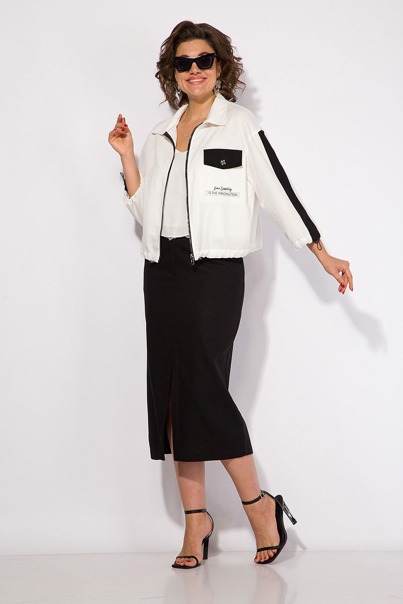 Эффектный весенне-летний жакет в стиле спорт-шик, выполнен из льна с добавлением вискозы. Модель свободного силуэта с центральной застежкой на молнию. Воротник отложной. Рукав на спущенном плечевом поясе, длиной ¾-ти. По центру рукава проходит лампас контрастного цвета. Низ рукава присборен на утяжку с регуляторами. Полочка декорирована печатью накатом и ассиметричным накладным карманом с клапаном. Оригинальная модель, отлично сочетается с однотонными брюками и юбками из базовой коллекции от бренда – ЛИЛИАНА!