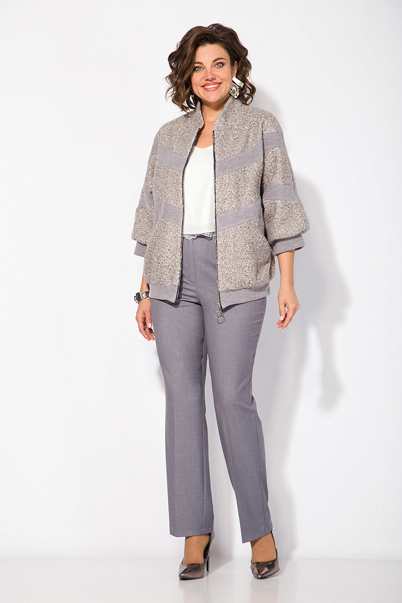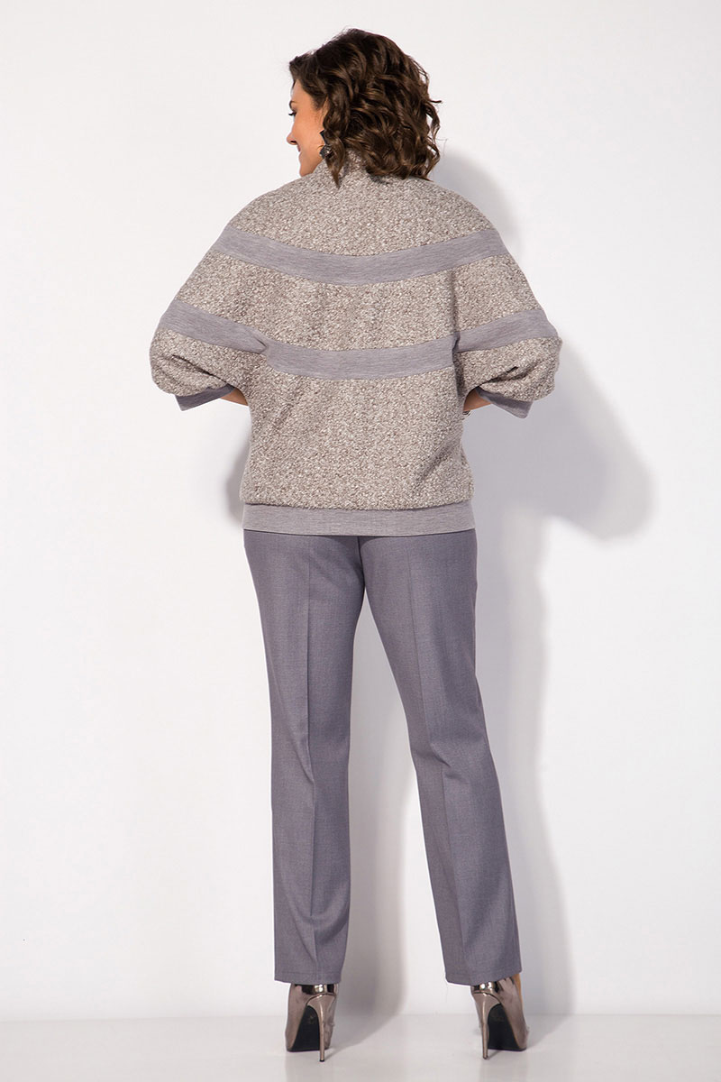 В комплекте брюки классические женские брюки, со средней посадкой, прямого покроя от бедра. Застежка – брючная тесьма-молния с обработанным гульфиком. Карманы боковые. Пояс притачной, в боковых участках вставлена резинка на свободу. По переду заутюжены канты. Спинка с талиевыми вытачками. Подгибка брюк –– 4 см.