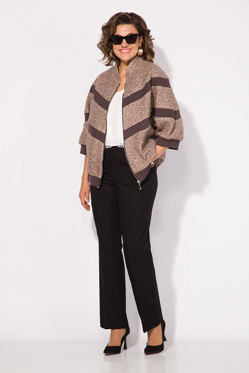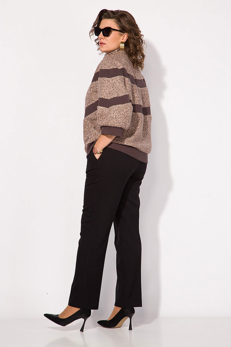 В комплекте брюки классические женские брюки, со средней посадкой, прямого покроя от бедра. Застежка – брючная тесьма-молния с обработанным гульфиком. Карманы боковые. Пояс притачной, в боковых участках вставлена резинка на свободу. По переду заутюжены канты. Спинка с талиевыми вытачками. Подгибка брюк –– 4 см.