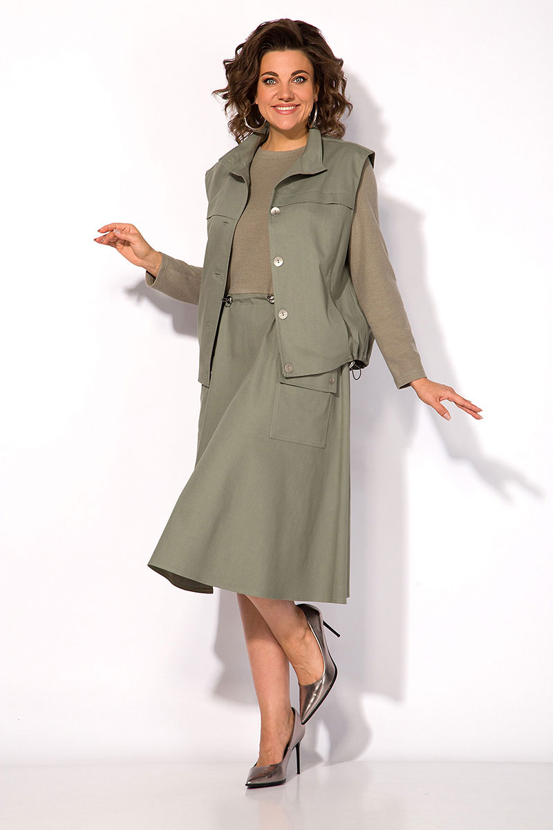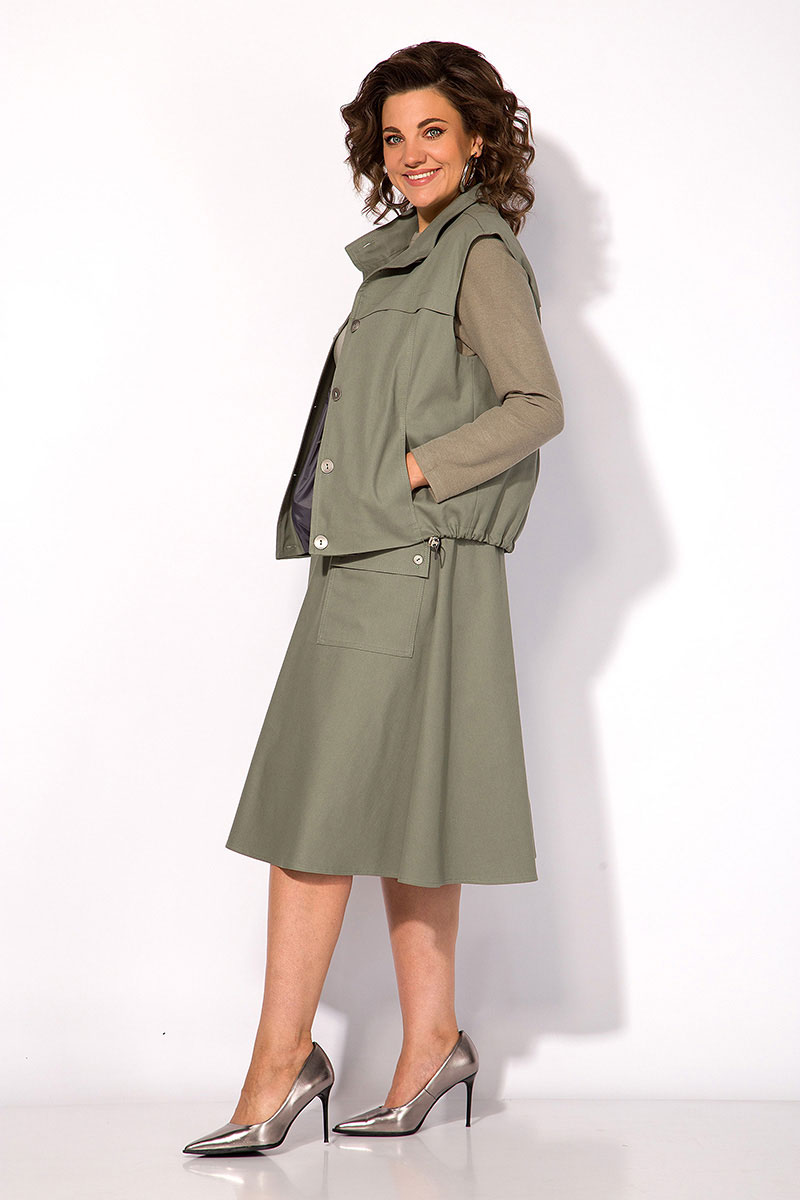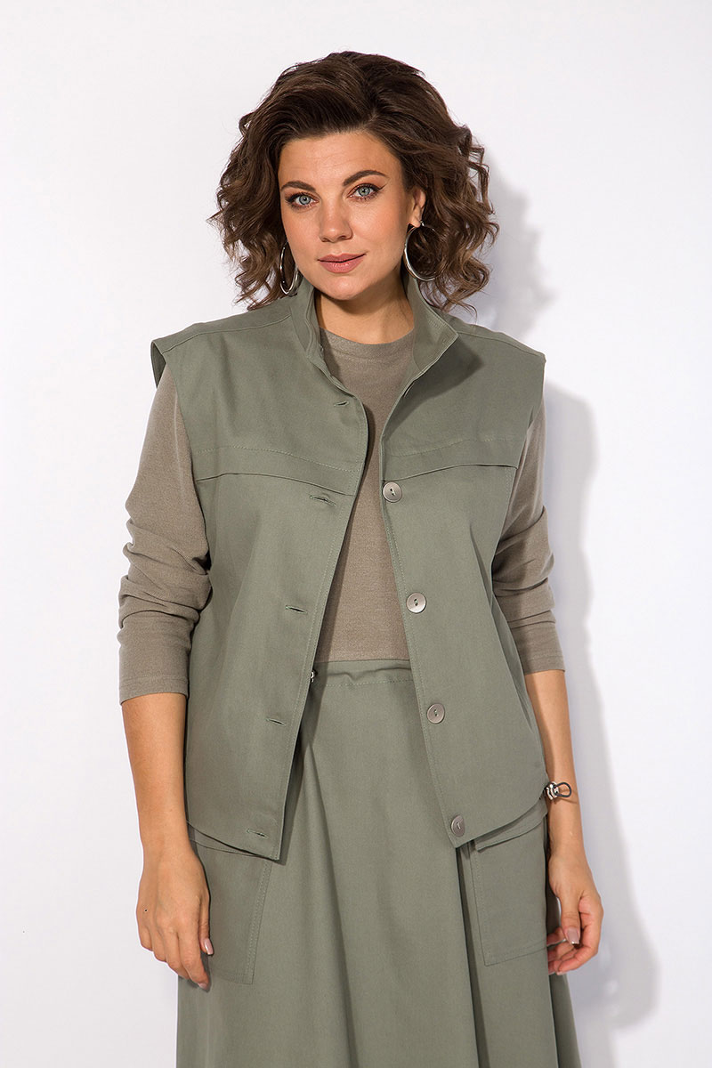 В комплект входит жилетка свободного силуэта, центральной бортовой застежкой на петли и пуговицы с воротником стойкой. Модель с декоративными кокетками по полочке и спинке. По переду расположены карманы в рельефных швах. Низ изделия присборивается на кулису с регуляторами. Жилетка на шелковой подкладке.
