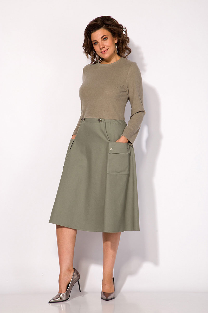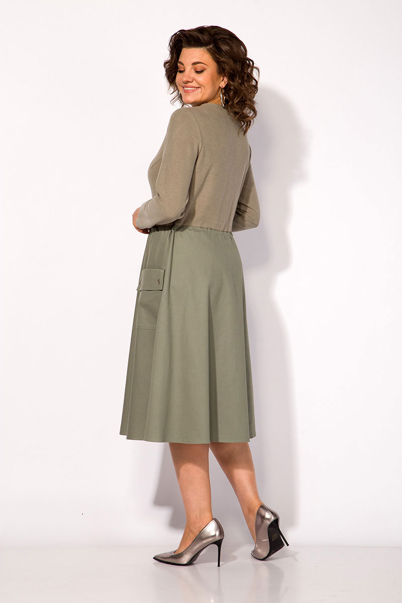 Комбинированное платье, полуприталенного силуэта, выполнено из сочетания мягкого трикотажа и хлопкового джинса. Платье с вточным рукавом полной длины и округлой мягкой горловиной. По талии предусмотрена кулиска с утяжкой. Платье с разклёшенной юбкой и накладными карманами.