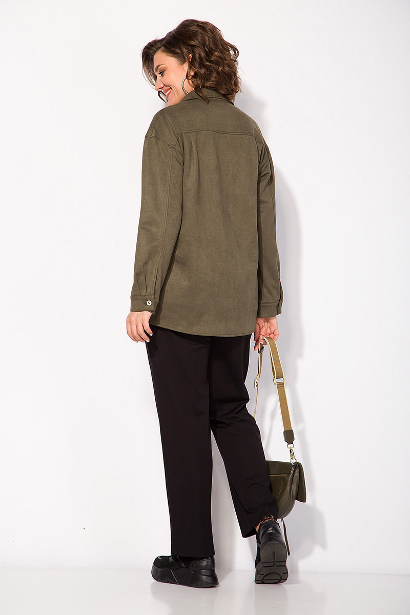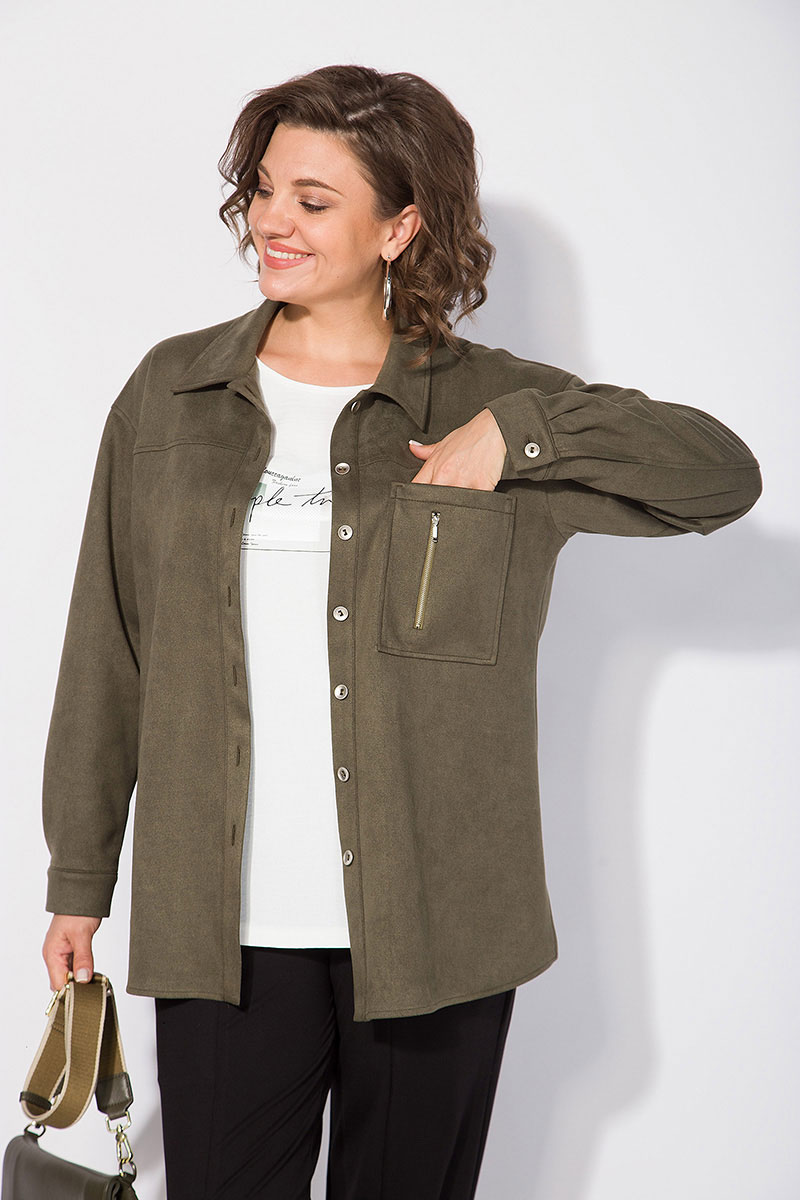 Модель свободного силуэта с отложным воротником на стойке. Застежка центральная на петли и пуговицы. Рукав на рубашечной пройме, длинный, низ оформлен манжетам. Полочка с ассиметричным накладным карманом с декором в виде молнии. Спинка на кокетке с заложенными складками на свободу движения. По бокам имеются карманы. В комплекте топ на спущенном цельнокроеном рукаве с округлым вырезом горловины. Лиф украшает печать накат в тон изделия.