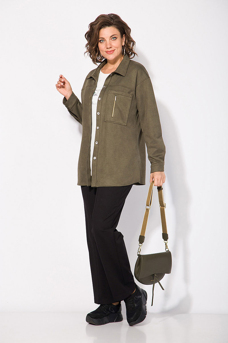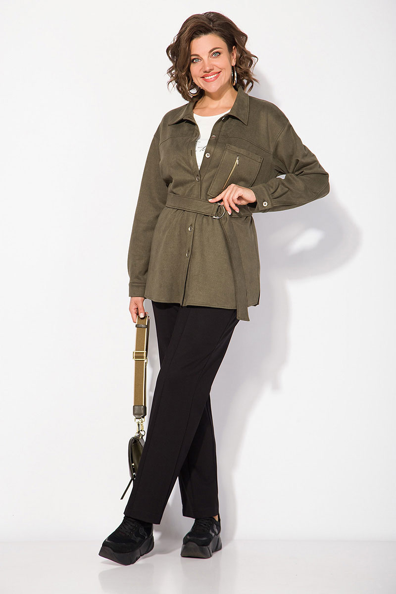 Модель свободного силуэта с отложным воротником на стойке. Застежка центральная на петли и пуговицы. Рукав на рубашечной пройме, длинный, низ оформлен манжетам. Полочка с ассиметричным накладным карманом с декором в виде молнии. Спинка на кокетке с заложенными складками на свободу движения. По бокам имеются карманы.