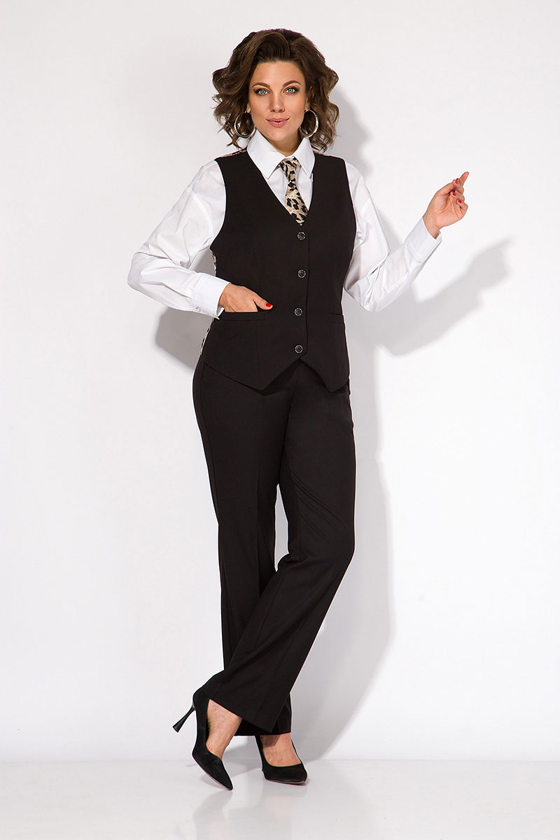 Жилетка полупрниталенного силуэта, с застежкой на пуговицы выполнена из костюмной ткани. По полочке расположены продольные рельефы с прорезными карманами. Спинка выполнена из шелкового сатина с эффектным принтом. Есть хлястик для приталивания. Жилетка на шелковой подкладке. Брюки в костюме со средней посадкой на притачном поясе-кокетке со вставками из отделочной ткани. Застежка – потайная тесьма-молния. По спинке имеется резинка. Брюки слегка заужены в области колена. Строгость и утонченность - основные характеристики женской костюмной двойки.