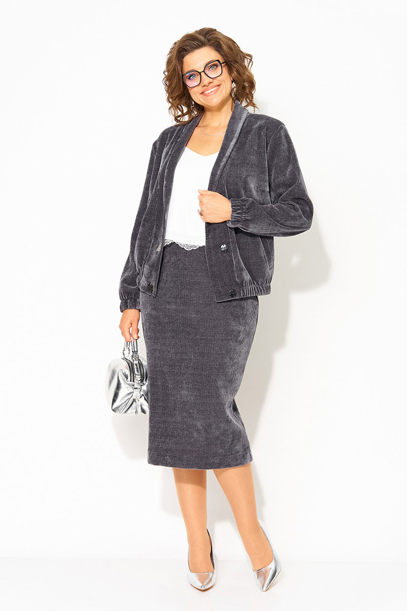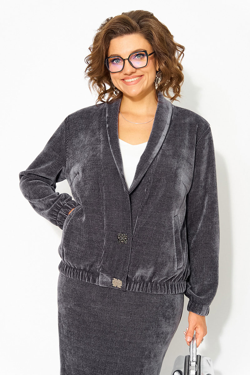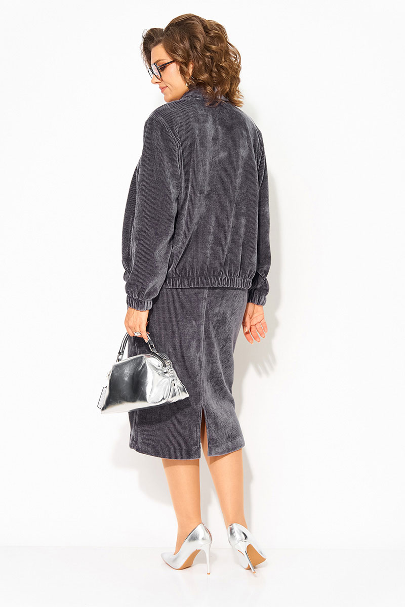 Модель состоит из свободного жакета, без подкладки с застежкой на потайные кнопки. Воротник отложной по типу шали. По полочке расположены прорезные карманы. Рукав полной длины, по низу присборен на резинку. Юбка классической длины за колено, на притачном поясе с резинкой. По спинке по центральному шву расположен разрез. Юбка на трикотажной подкладке.