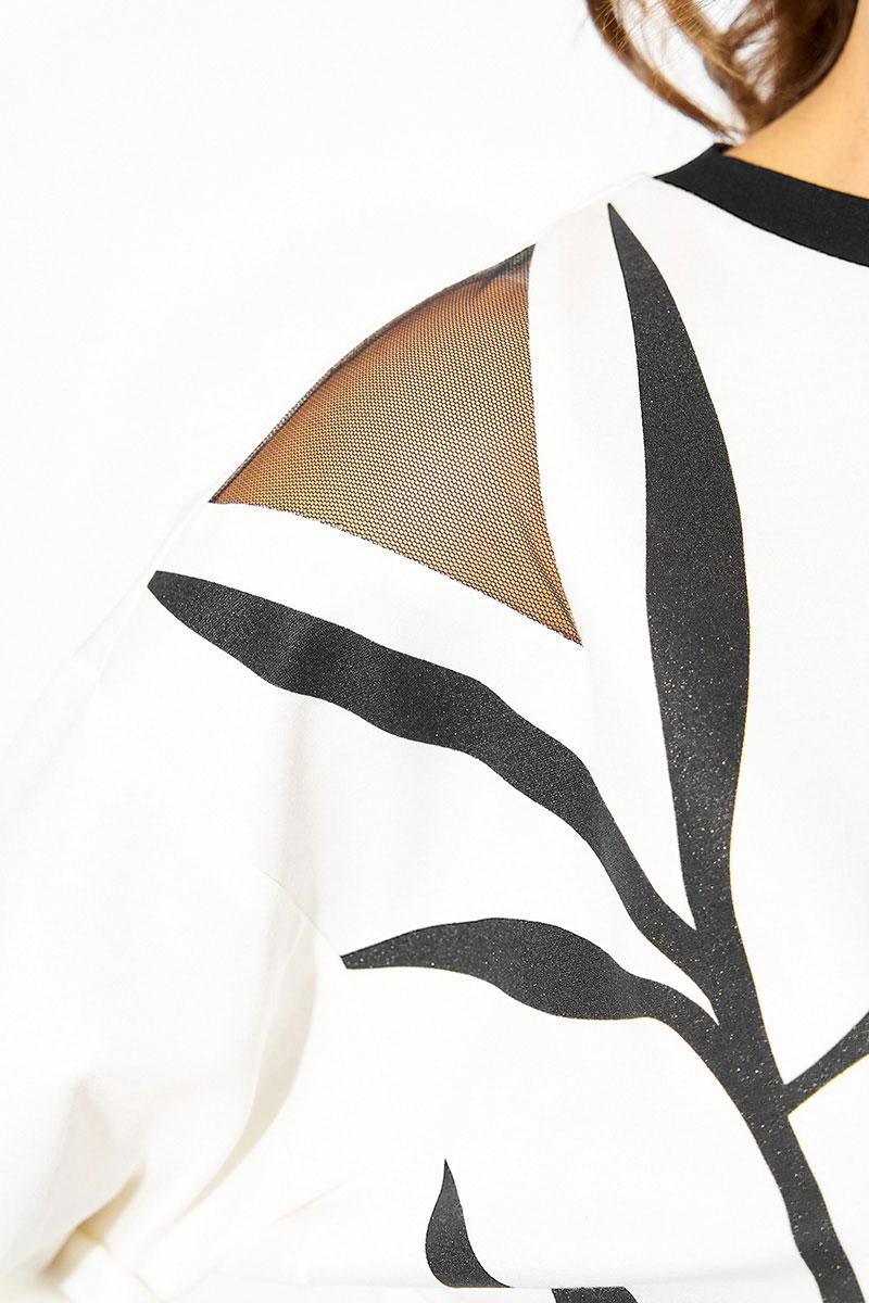 Нарядная блузка-туника больших размеров, выполнена из трикотажного джерси. Модель прямого силуэта, со спущенной линией плеча и рукавом длиной ¾-ти. Модель с округлым вырезом горловины на мягкой притачной планке контрастного цвета. По бокам предусмотрены разрезы на свободу. Полочка декорирована печатью накатом с мерцающим эффектом в виде ветви. На плече ассиметричная вставка из сетки. Вы в поиске универсальной блузки которую легко совмещать с разными образами? Тогда ваш выбор наша блузка женская, которая идеально решит все эти задачи!