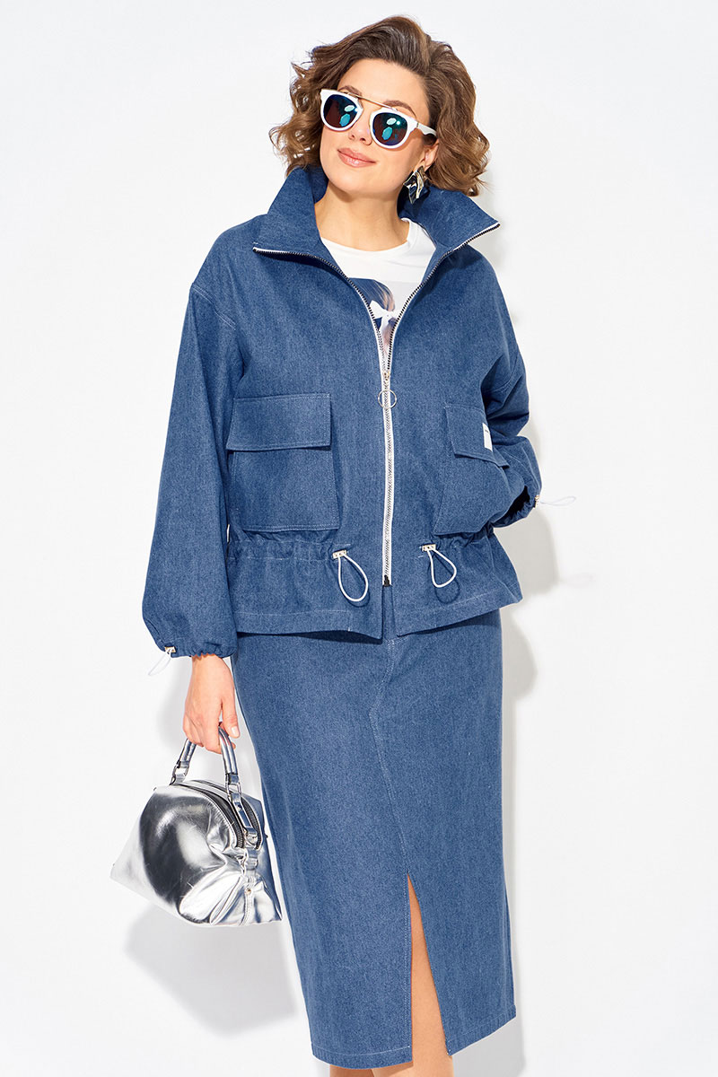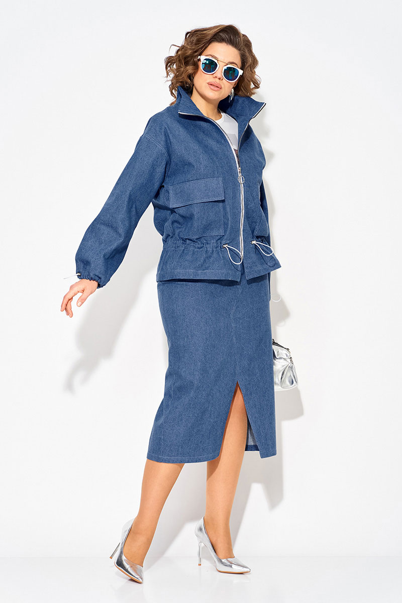 Модный и стильный юбочный женский костюм из денима с жакетом и юбкой — идеальный выбор для создания стильного образа! Жакет свободного силуэта, по типу «джинсовки» с застежкой на молнию. Воротник-стойка, комфортно прилегает к горловине. Рукав длинный, на спущенном плечевом поясе. Низ рукава оформлен на кулиску. Полочка с накладными карманами с клапаном. Чуть ниже талии предусмотрена кулиска для комфортного и более плотного прилегания. Юбка в костюме длиной миди, слегка заужена к низу. Застежка-брючная тесьма-молния с обработанным гульфиком. Пояс притачной, в боковых участках вставлена резинка. В юбке предусмотрены боковые карманы, а также накладные карманы сзади. Фигурный разрез по центру привлекает внимание окружающих!