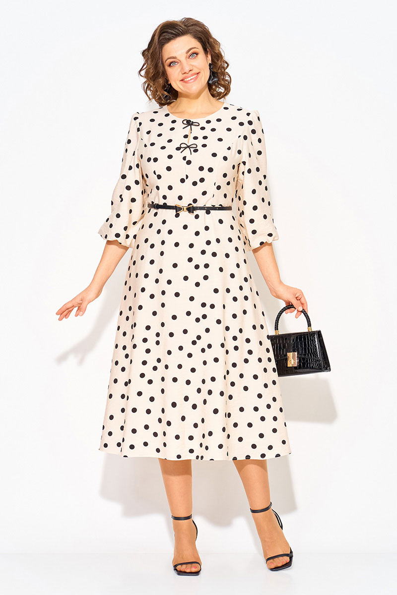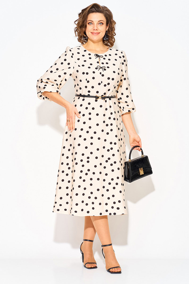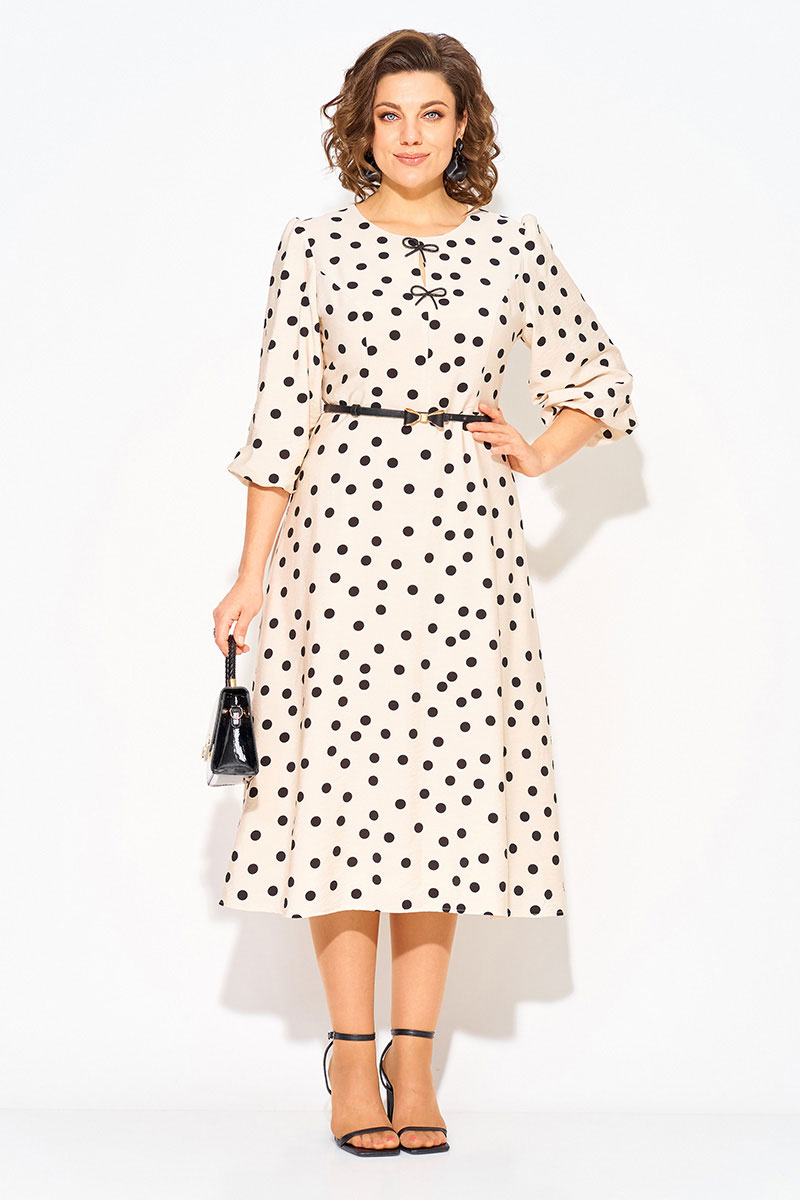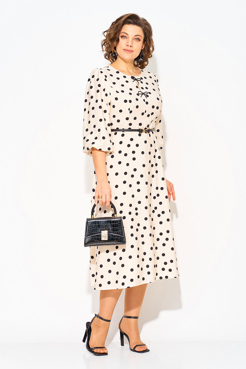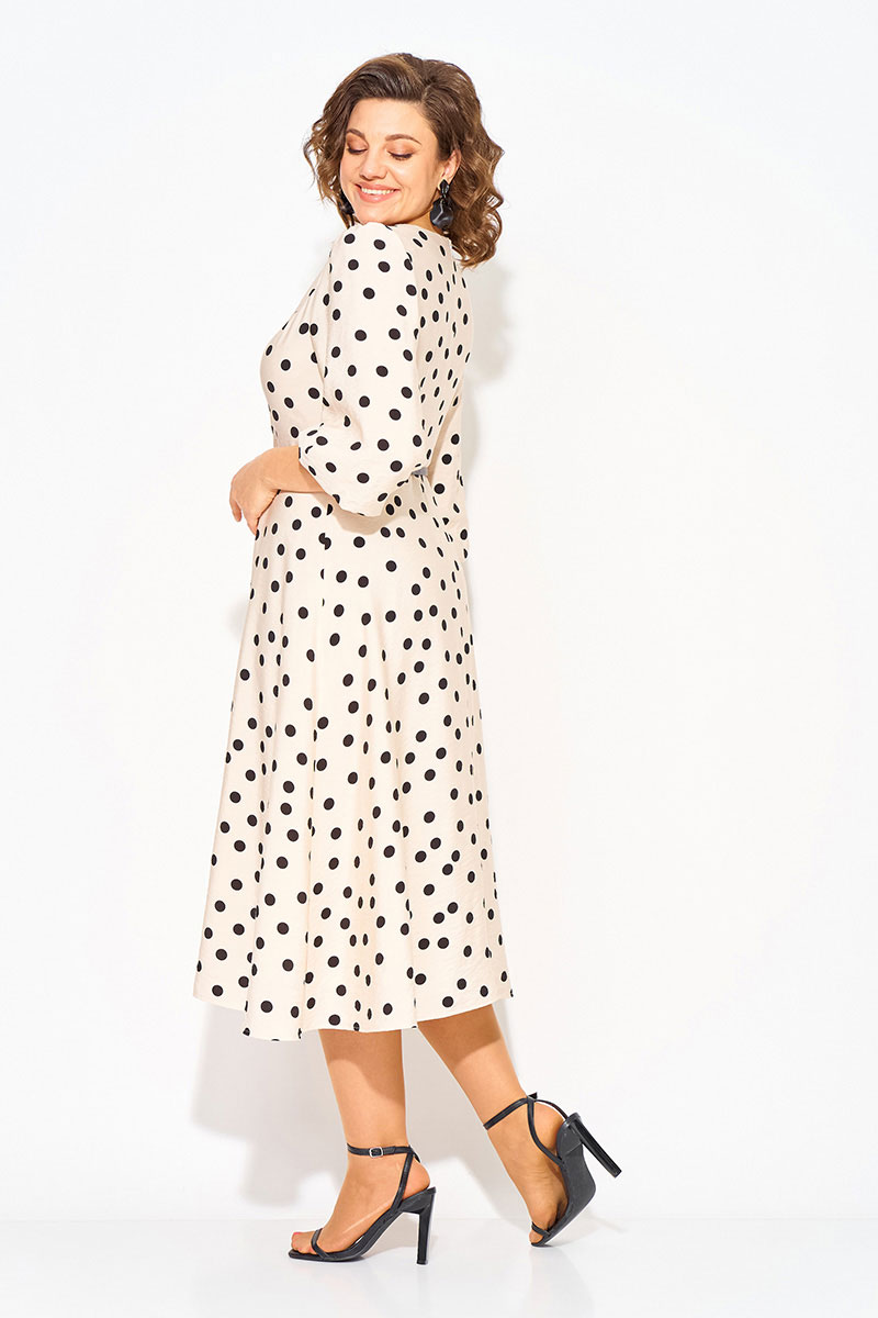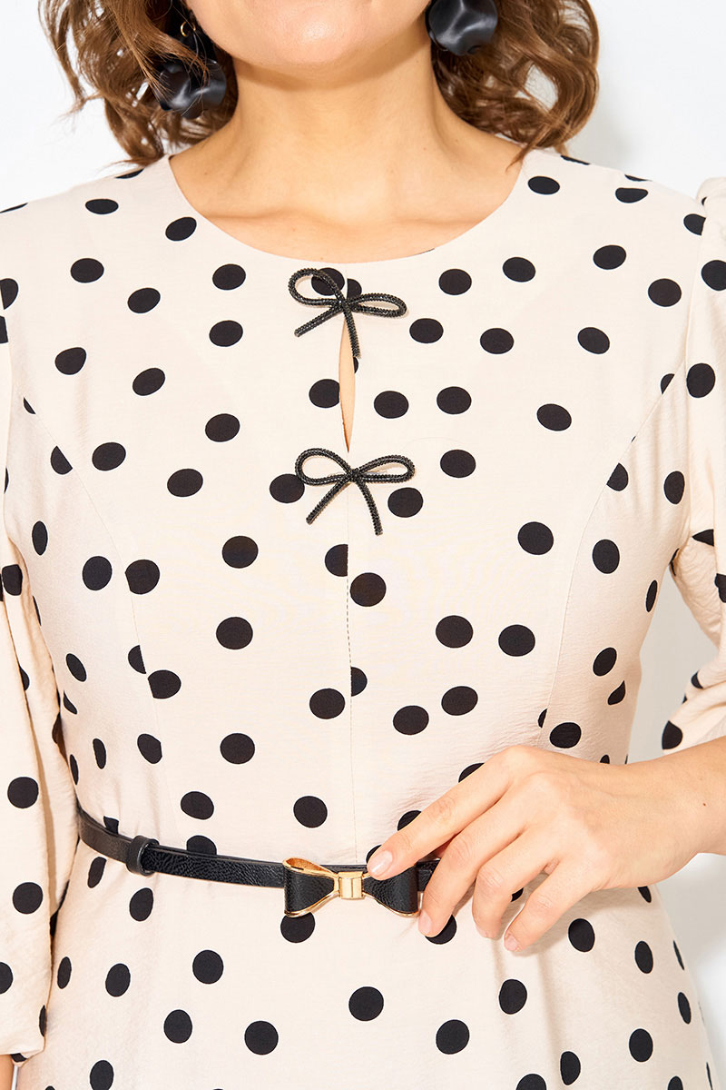 Волшебное и неповторимое - это женское платье с округлым вырезом горловины в горох, созданное талантливым дизайнером олицетворяет элегантность и стиль. Выполненное из вискозно-хлопкового материала, это платье обеспечивает комфорт и свободу движений. Модель отрезная по линиям талии, с продольными рельефами по полочке. Юбка расклешена к низу – полу солнце. Эффектный рукав-фонарик длиной ¾-ти, присборен по окату и поставлен на трикотажную подкладку. Небольшая капелька по лифу украшена съёмными брошами в виде банта. Застежка – потайная тесьма-молния по спинке.Низ юбки на подкладке.