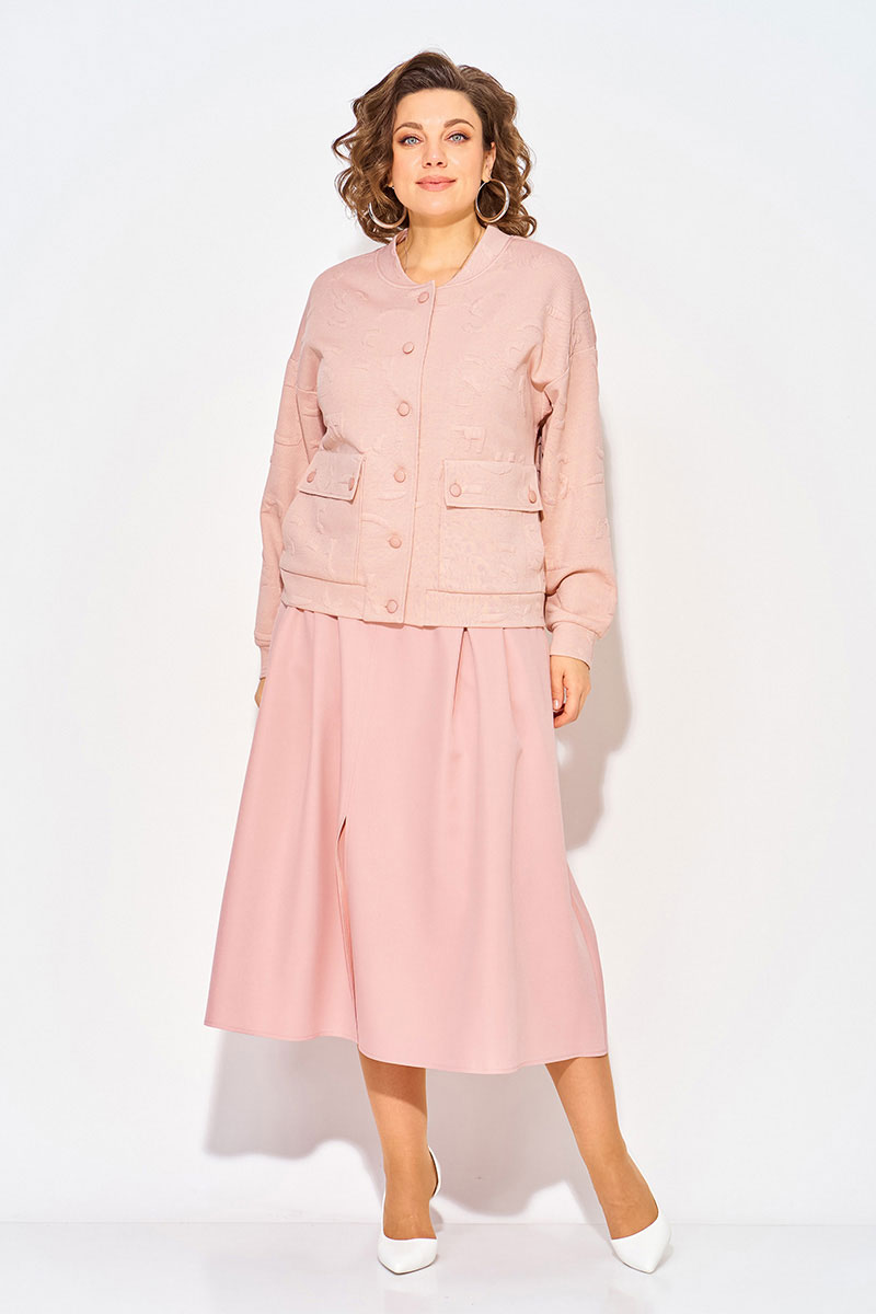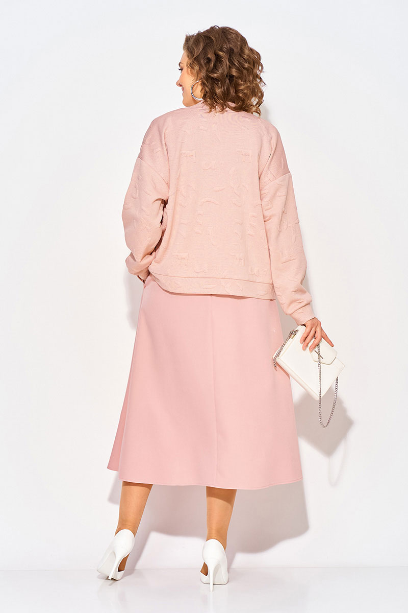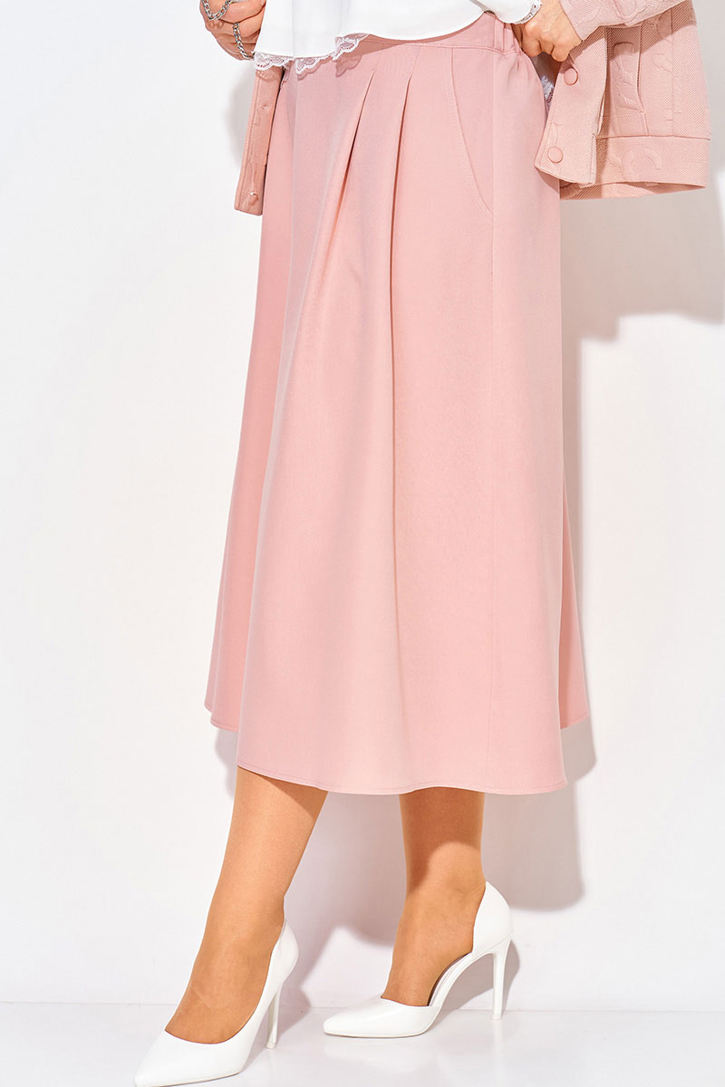 В комплект входит юбка длиной миди А-силуэта на притачном поясе с резинкой. По переду заложены складки, имеются боковые карманы. Пикантность образу придает разрез по центру юбки. Застежка – юбочная тесьма-молния по центральному шву спинки. Идеален для женщин, девушек и подростков, которые ценят комфорт, свободу движений и универсальность. Такой модный костюм станет отличным выбором как для повседневных образов, так и для встреч, прогулок и мероприятий.
