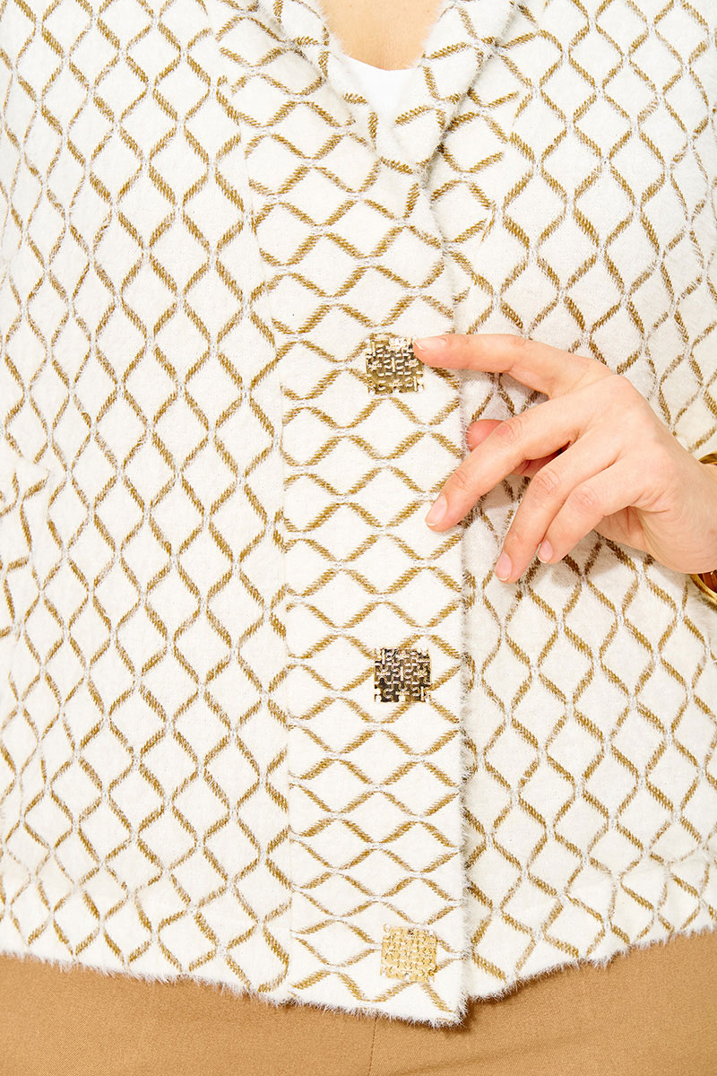 Трикотажный кардиган с эффектным принтом – отличный выбор для повседневной одежды в офис и для особого случая. Модель выполнена из мягкого материала, который приятно ощущается на теле. Укороченный фасон, присборен по низу на резинку, придает пикантность образу. Воротник отложной по типу шали. По полочке расположены прорезные карманы. Металлические пришивные кнопки служат не только функциональным элементом застежки, но и подчеркивают аккуратность изделия. Короткий кардиган оверсайз в стиле old money разработан с учетом особенностей: он хорошо сидит по фигуре, не стесняет движений. Отлично сочетается с базовыми брюками из коллекции от бренда «Лилиана».