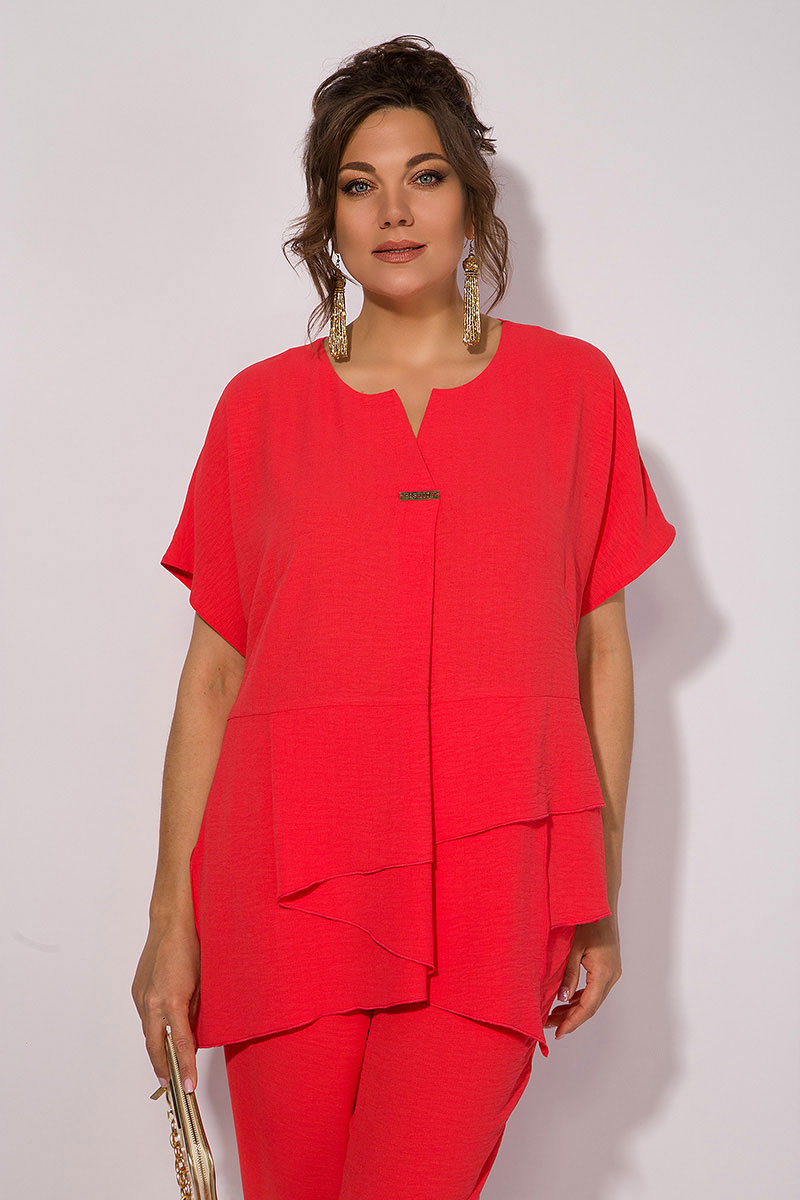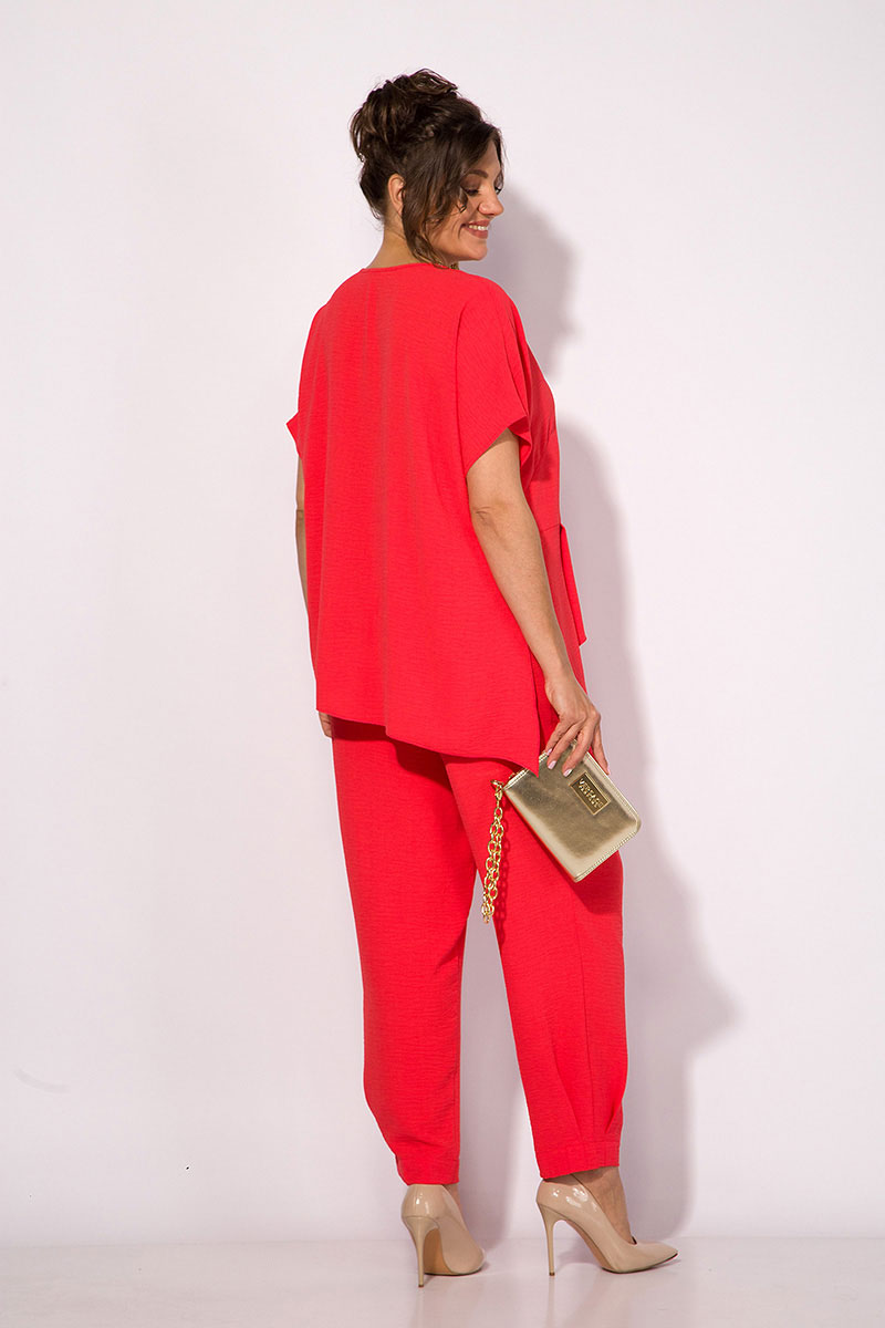 Стильный летний костюм состоящий из ассиметричной туники и свободных брюк. Модель туники свободного силуэта, со спущенным цельнокроеным рукавом. Вырез горловины округлый, переходящий в V-образный мыс с заложенной складкой. По линии талии заложена декоративная ассиметричная деталь, что создает необычный эффектный образ и скрывает все недостатки, подчеркивая достоинства. Брюки со средней посадкой, на притачном поясе с резинкой. По бокам расположены карманы. По низу брюк заложены декоративные складки, что создает эффект восточного образа!