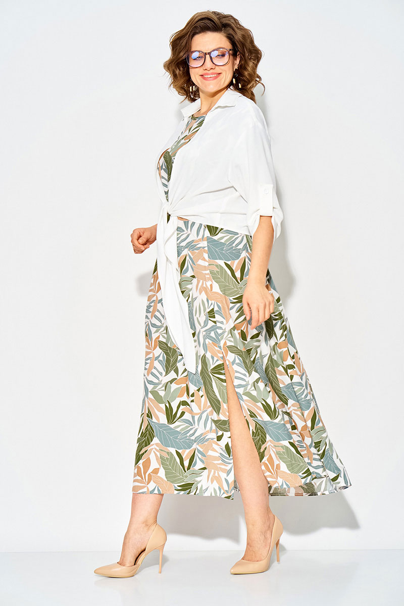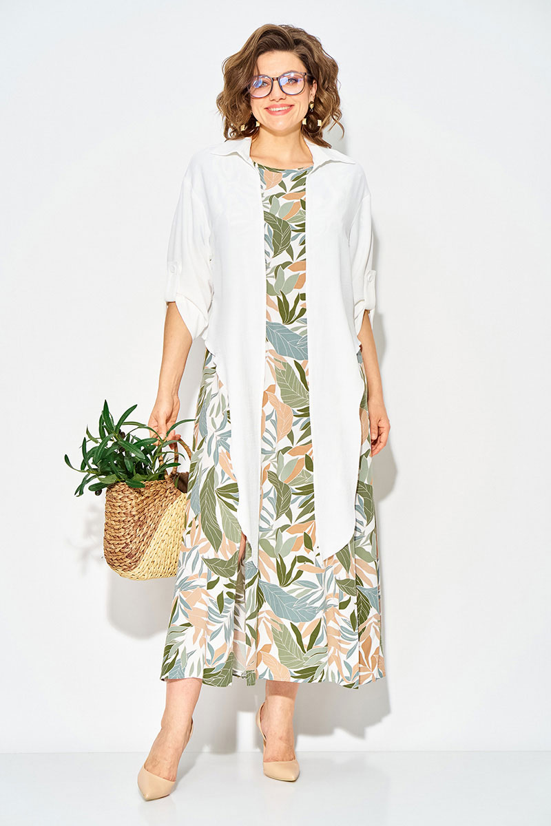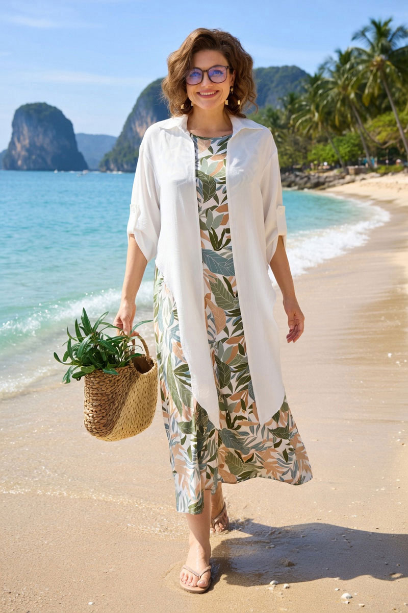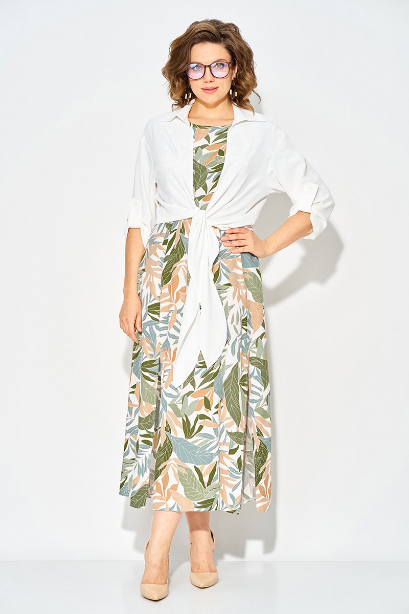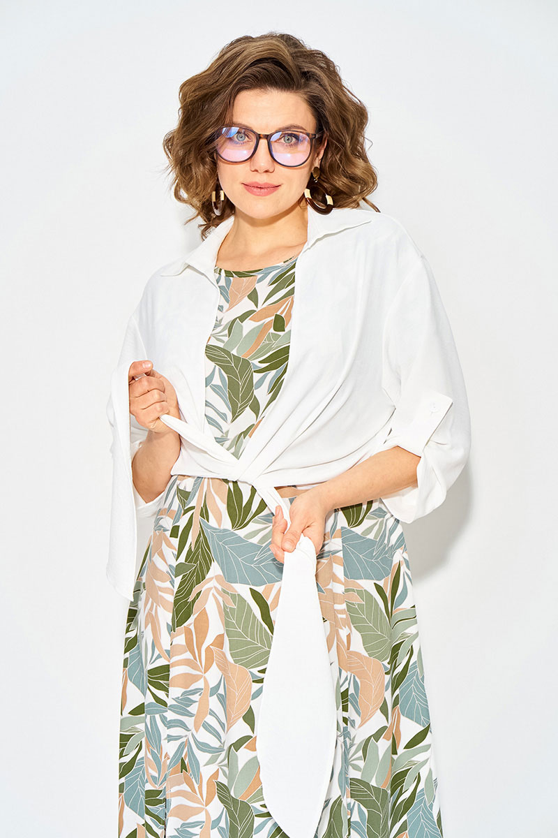 Платье женское с рубашкой маст хэв сезона 2026 в вашем гардеробе, создаст шикарный образ этой весной и летом. Платье хлопковое полуприталенного силуэта с тропическим принтом. Модель с продольными рельефами по полочке и спинке. Вырез горловины округлый. Рукав цельнокроеный слегка спущенный. По переду платья предусмотрены разрезы. Спинка с резинкой для более комфортного облегания. В комплекте к платью идет свободная рубашка с отложным воротником на стойке. Рукав длиной ¾-ти с застежкой на пате. По спинке предусмотрена кокетка с бантовой складкой. Рубашка без застежки, фиксируется завязкой по переду.