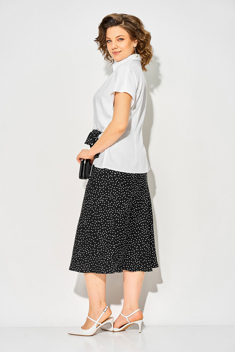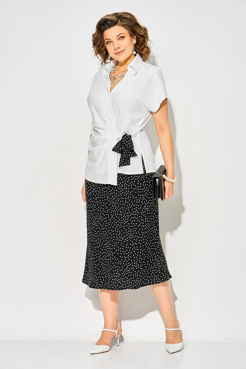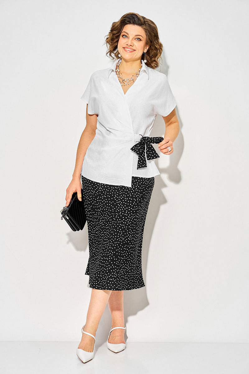 Стильный костюм состоящий из эффектной блузки и юбки из штапеля в трендовый горох создана специально для plus size-фигур, сочетая лёгкость, комфорт и идеальную посадку. Крой юбки по-косой обеспечивает мягкое прилегание, красиво струится при движении и визуально вытягивает силуэт. Модель на цельнокроеном поясе с резинкой. Блузка полуприталенного силуэта на запах, с v-образным вырезом горловины и отложным воротником на стойке. Рукав цельнокроеный, спущенный. Ассиметричные складки, переходящие в драпировку в области талии, скрывают все недостатки, подчеркивая ваши достоинства. Спинка прямая, с талиевыми выточками; по бокам предусмотрены разрезы. Изюминкой данной модели служит ассиметричная завязка на съемный платок на 2 полукольца.