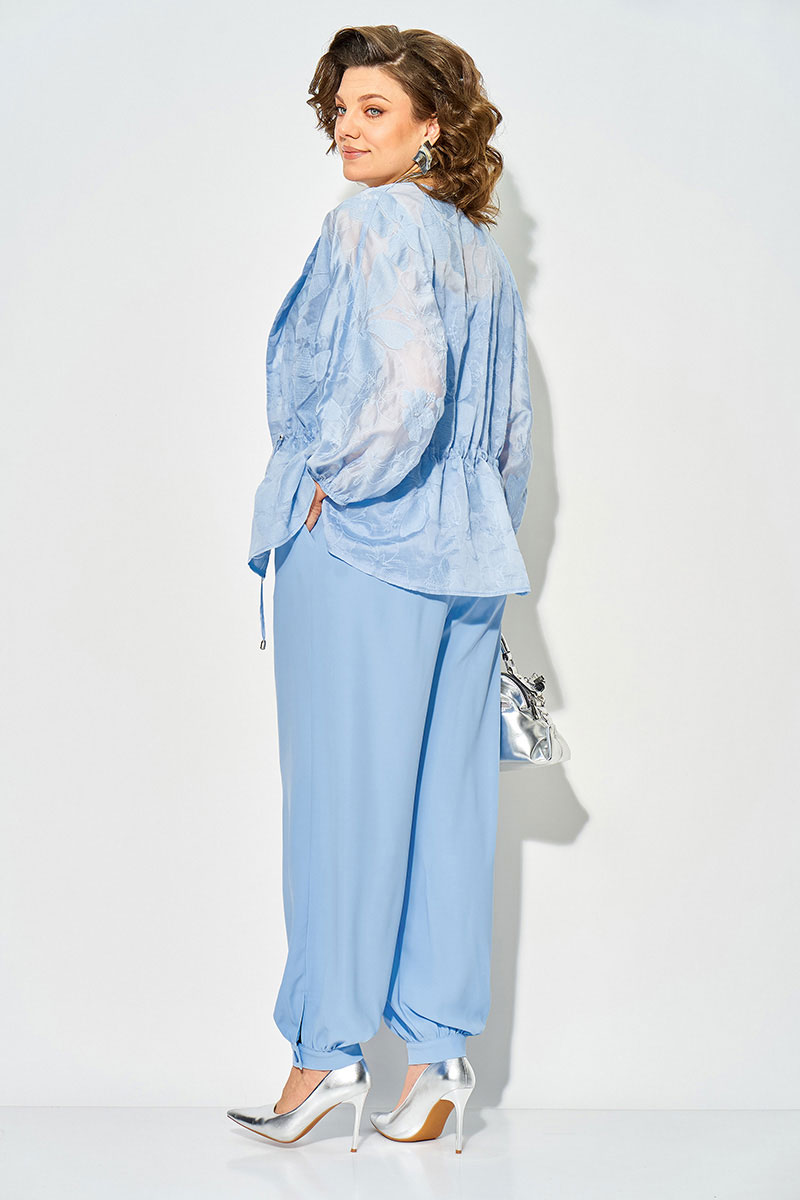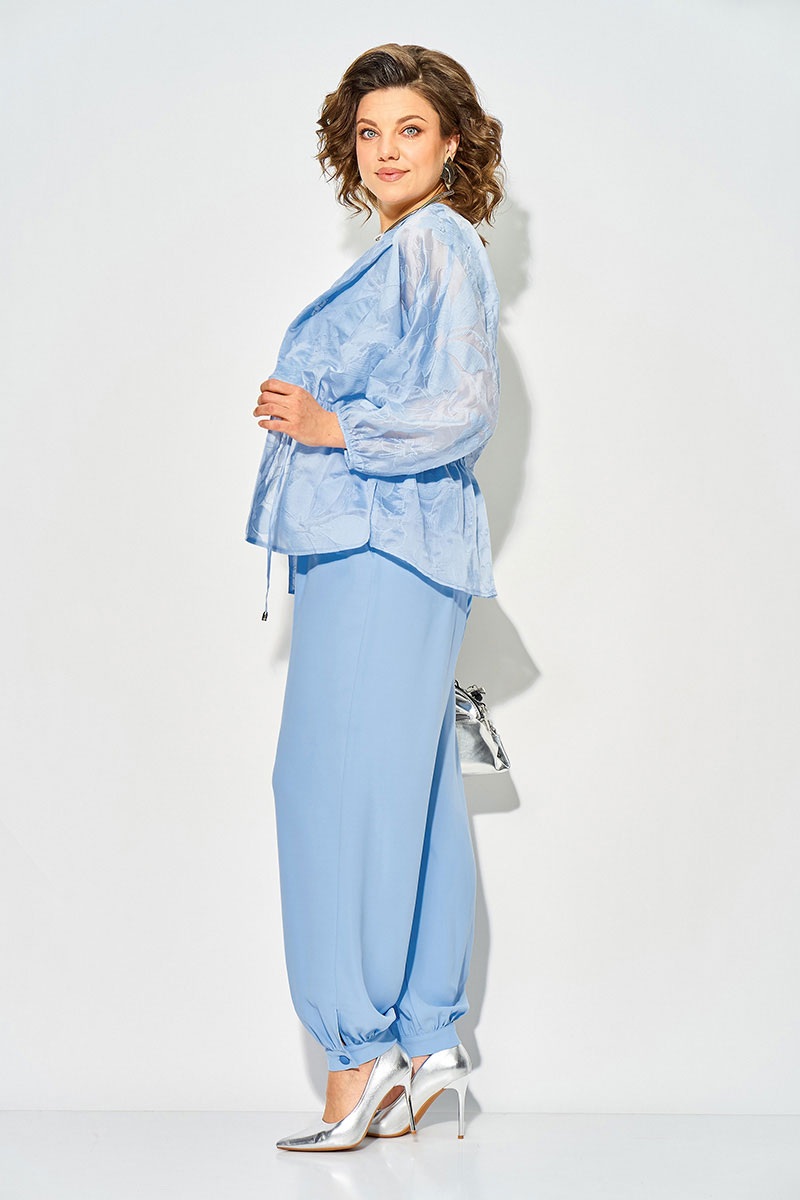 Нарядный брючный костюм - эталон стиля и элегантности. Эффектный костюм включает в себя брюки «султанки», топ на регулируемых бретелях и свободную блузон- накидку из батиста с хлопковой вышивкой. Блузон свободного силуэта, с цельнокроеным рукавом длиной ¾-ти на резинке по низу. Модель с подбортом и регулируемой кулисой по талии. Топ скроен по-косой, слегка расклешен к низу, что обеспечивает 100% посадку по фигуре. Брюки в костюме с завышенной посадкой, на круговом поясе с резинкой. В боковых швах предусмотрены разрезы. Низ брюк оформлен манжет со сборкой на пуговицу. Брючная тройка не останется вас без внимания на торжественных мероприятиях, а свободный крой обеспечит идеальную посадку благодаря большому размерному ряду в соответствии с молодежным трендом!