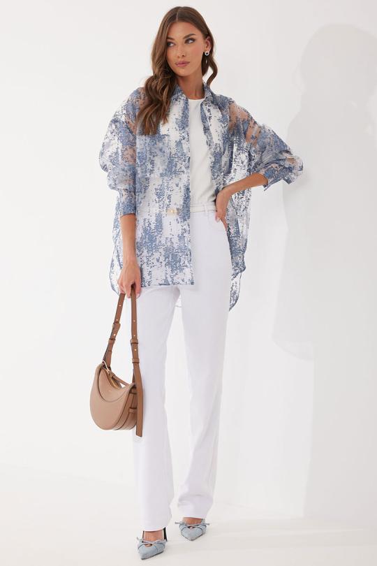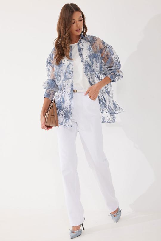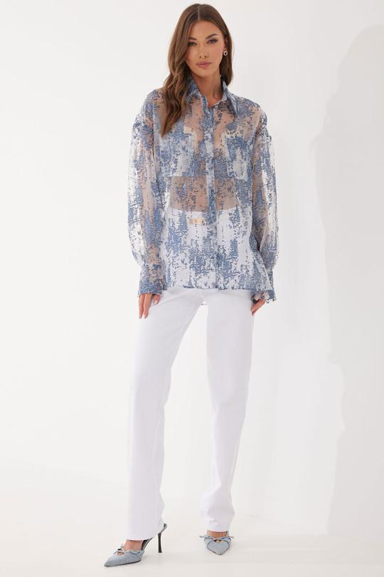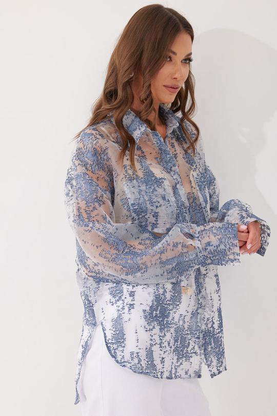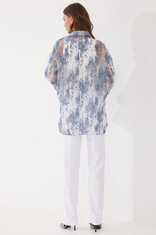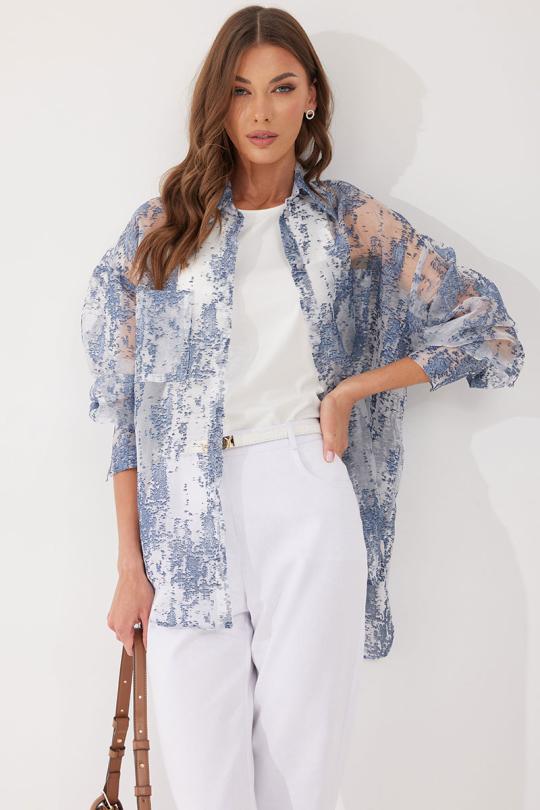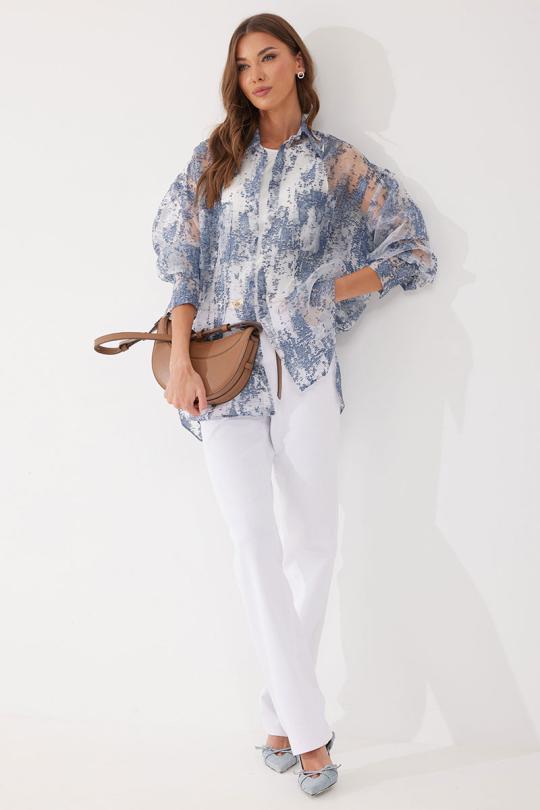 Блузка прямого силуэта из органзы с фигурным низом. Воротник рубашечного типа с застежкой по центру на петли и пуговицы. Рукав со спущенной линией плеча, по низу манжета с застежкой