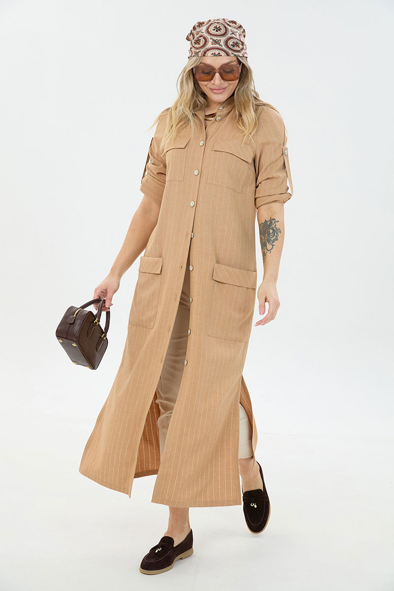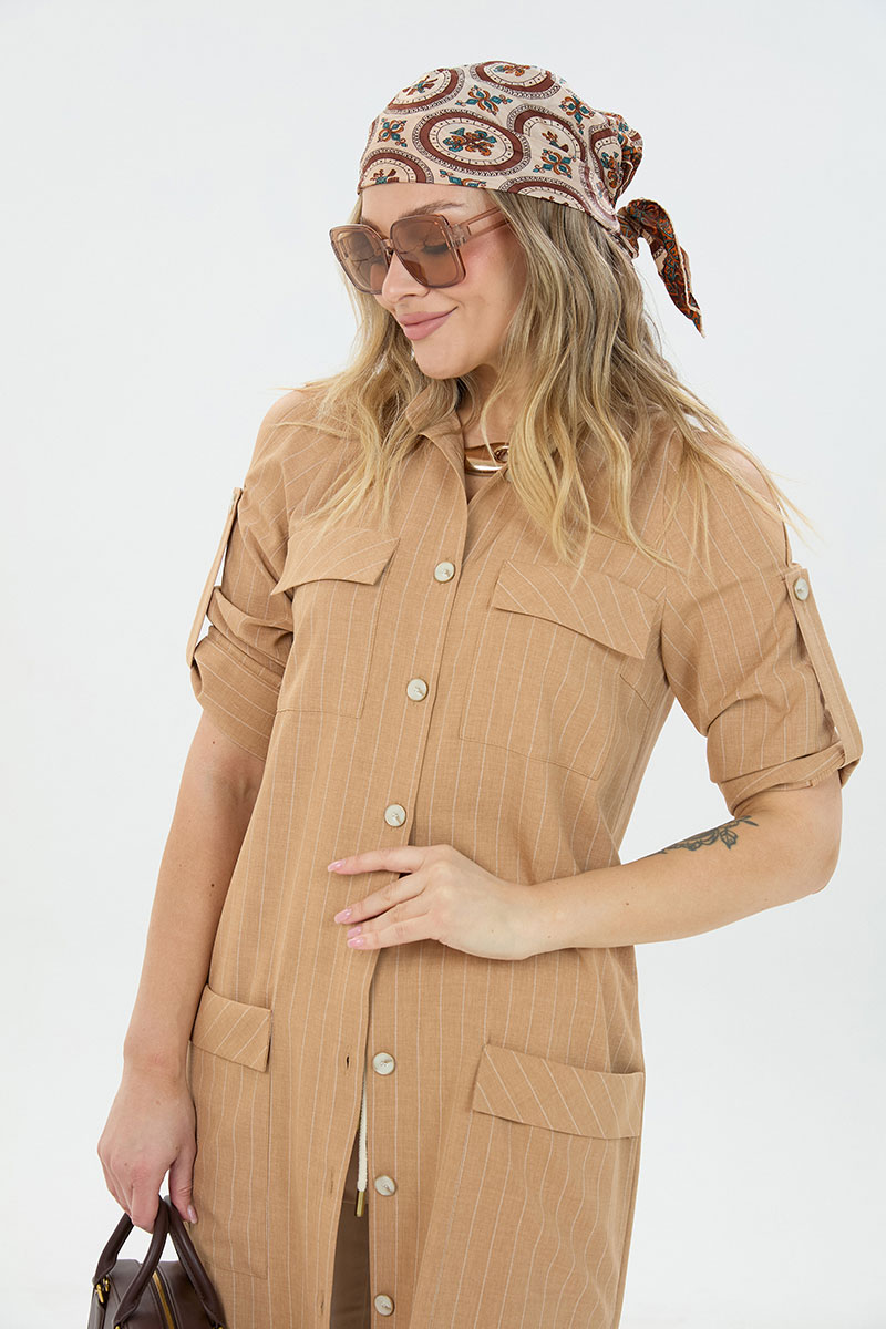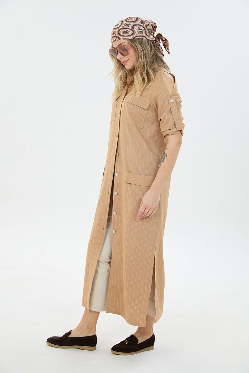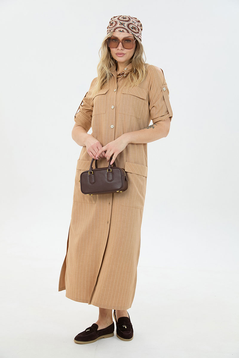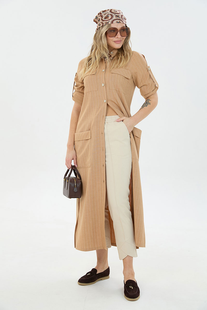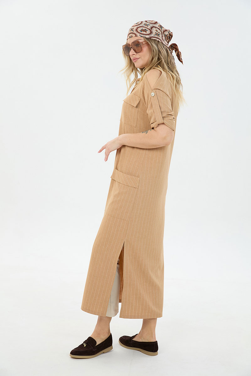 Комплект 2ка, состоящий из платья и брюк. Платье длины макси из с застёжкой на пуговицы и разрезами по бокам. По переду две пары накладных кармана, горловина – стойка. Рукава платья дополнены шлейкой с застёжкой на пуговицу для сборки, на плечах стильные разрезы. Удобные повседневные брюки из лёгкой натуральной ткани. Брюки свободного прилегания по бедрам и зауженные к низу. Пояс на эластичной тесьме с кулисой и втянутым шнурком. Вход в карман фигурный, наклонный к боковому шву.