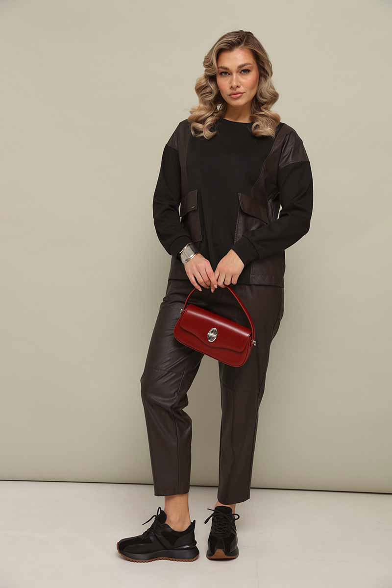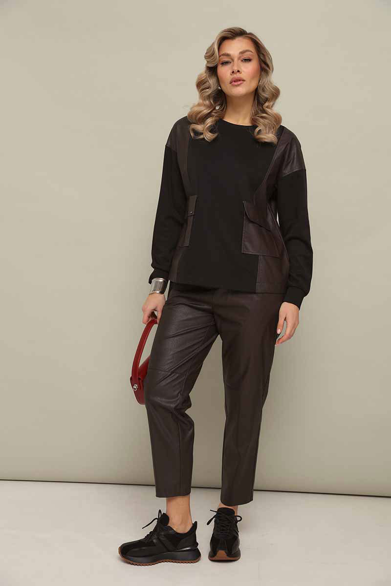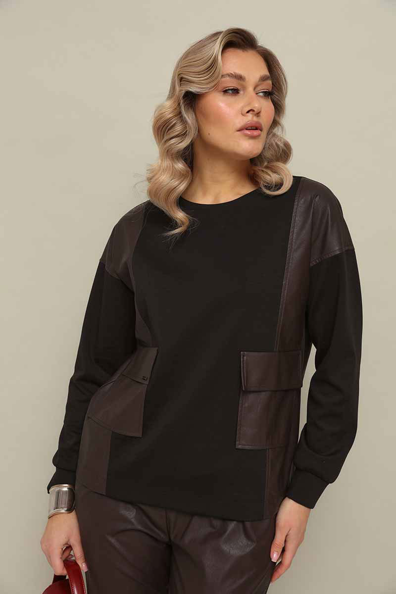 Трикотажный джемпер свободного кроя с длинными рукавами и круглой горловиной. Передние накладные карманы и боковые вставки выполнены из экокожи.