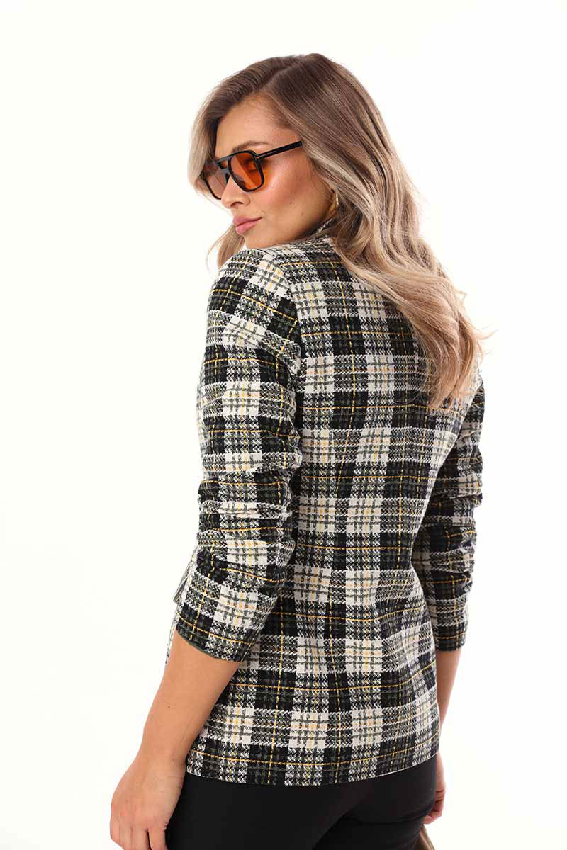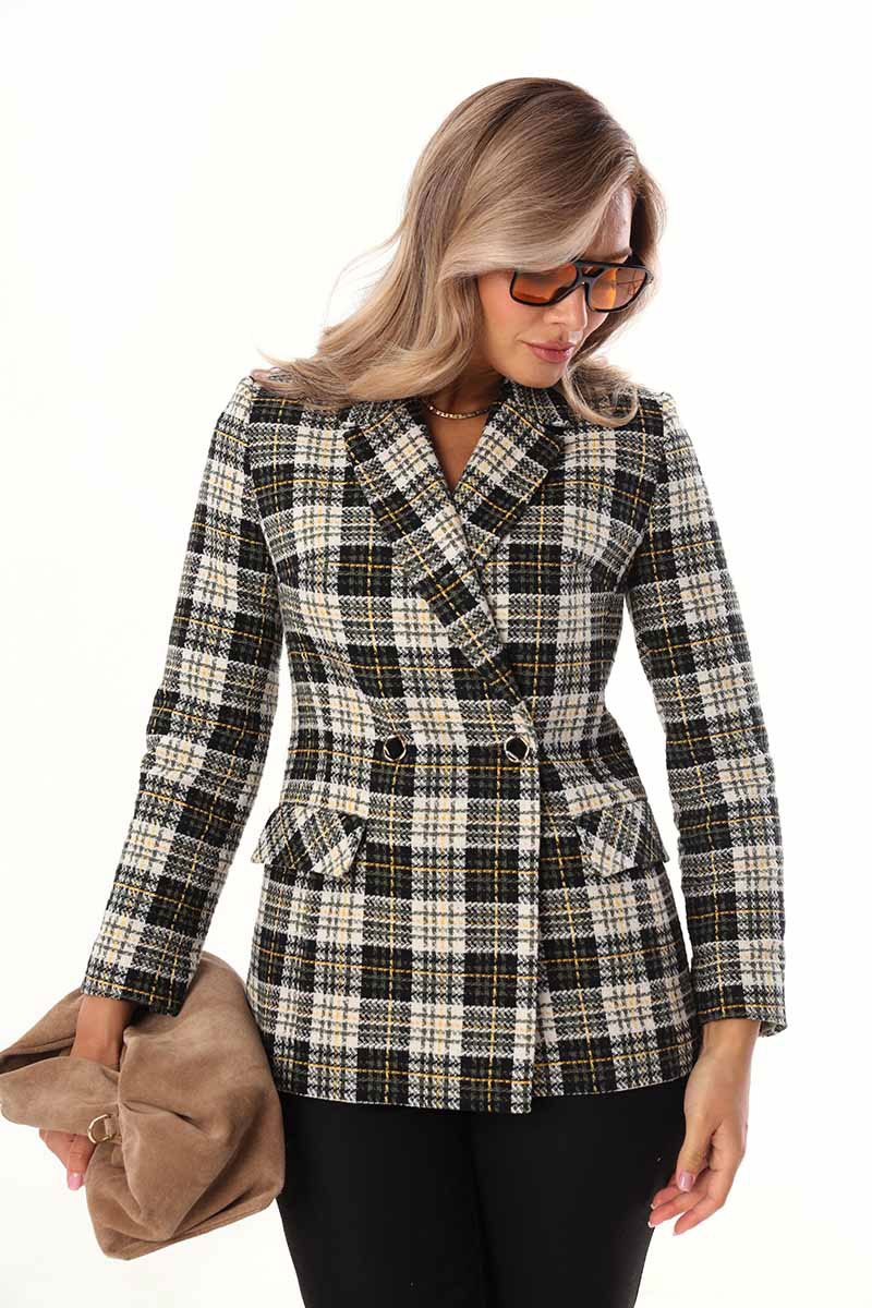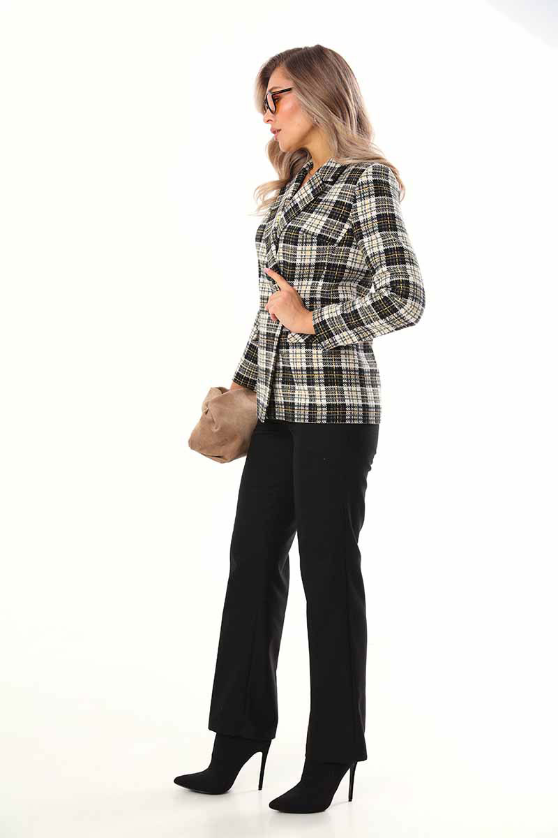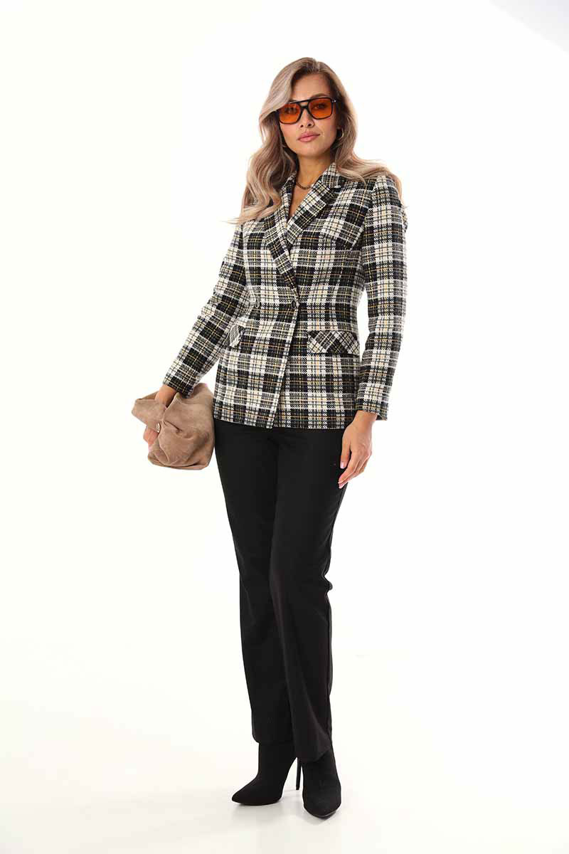 Жакет двубортный умеренного объёма из твидовой мягкой ткани. Застёжка на две пуговицы. По бокам расположены функциональные прорезные карманы с клапаном. Жакет на подкладке.