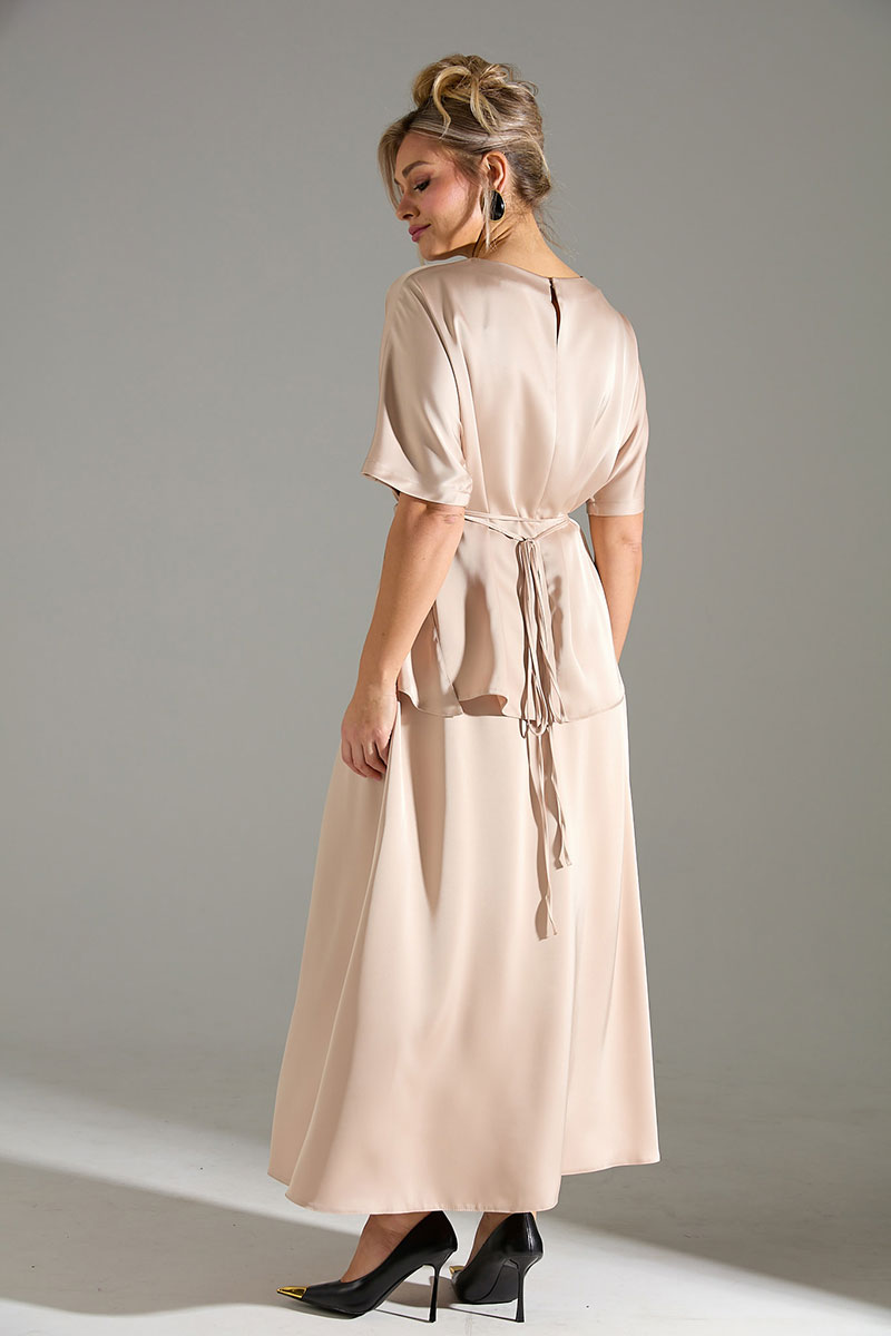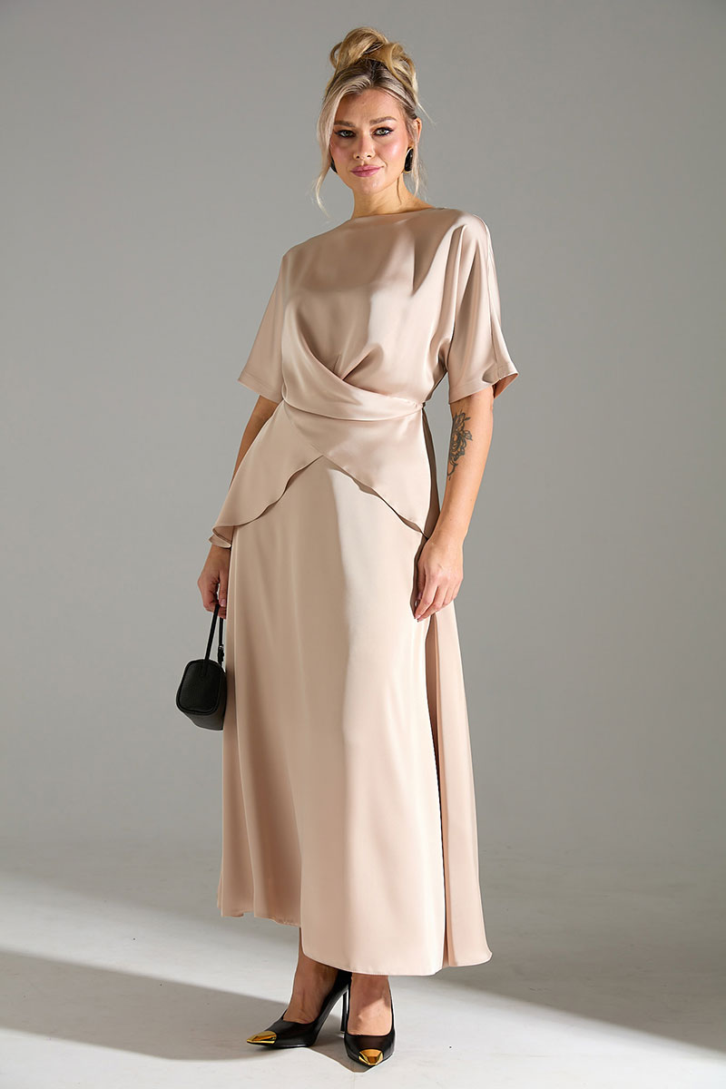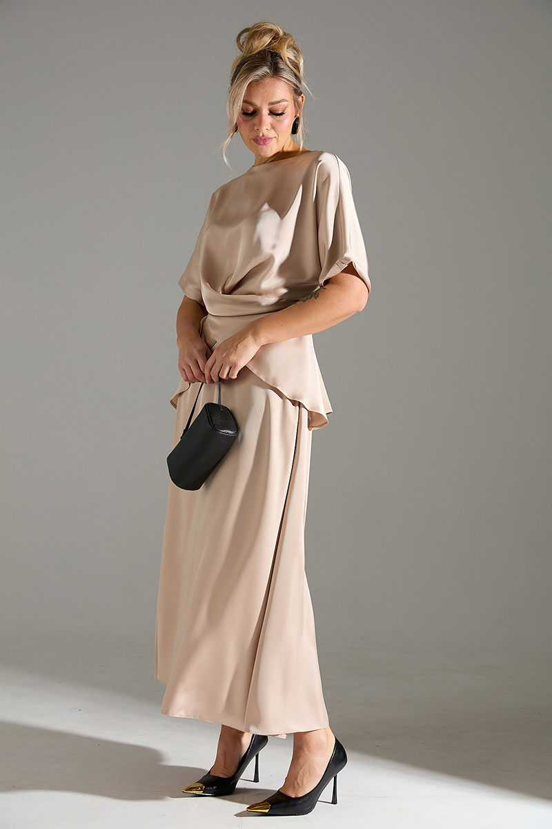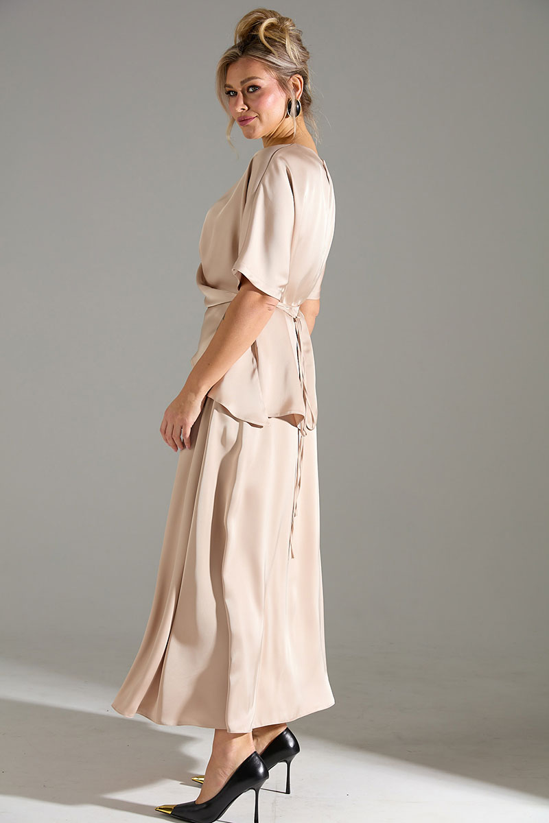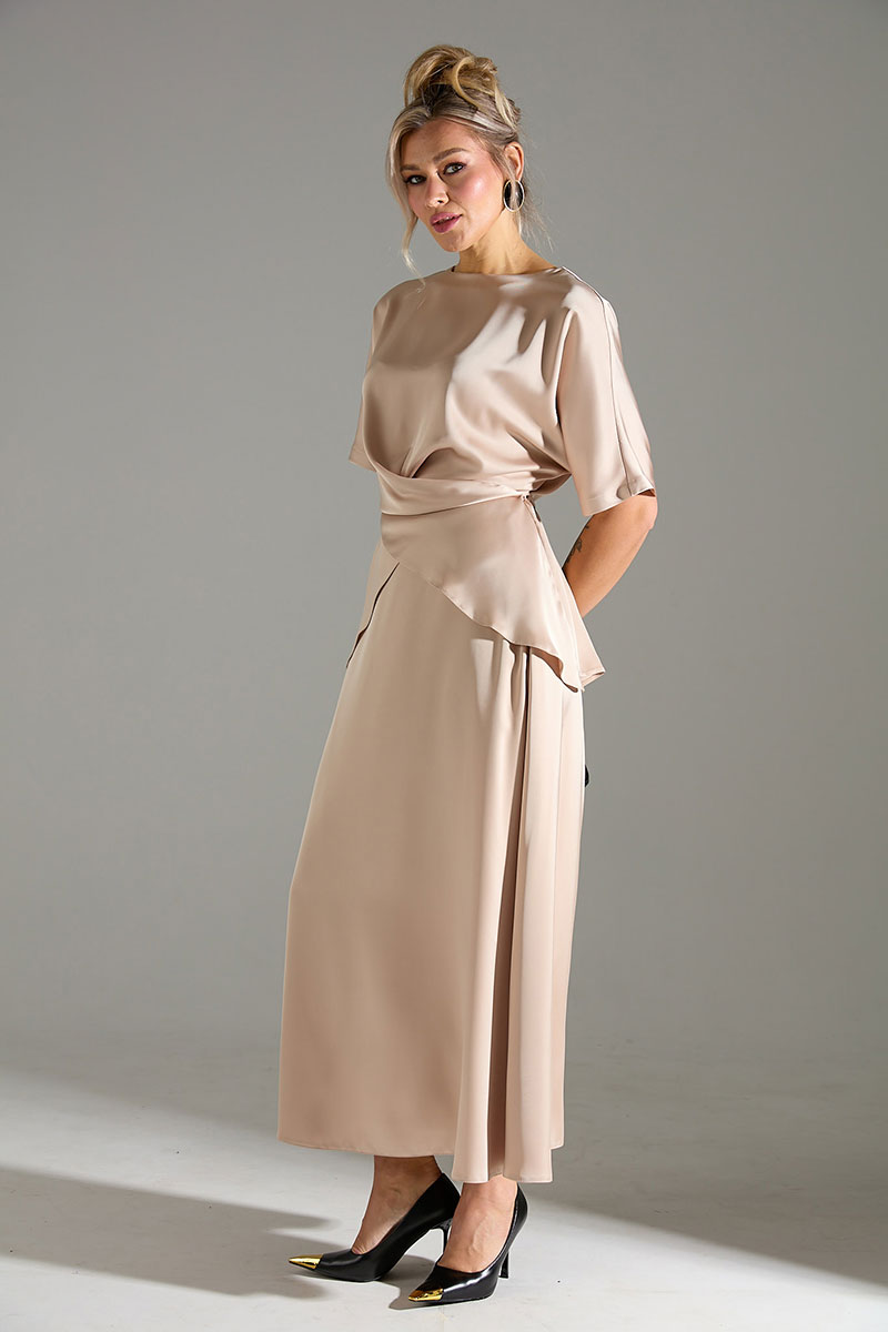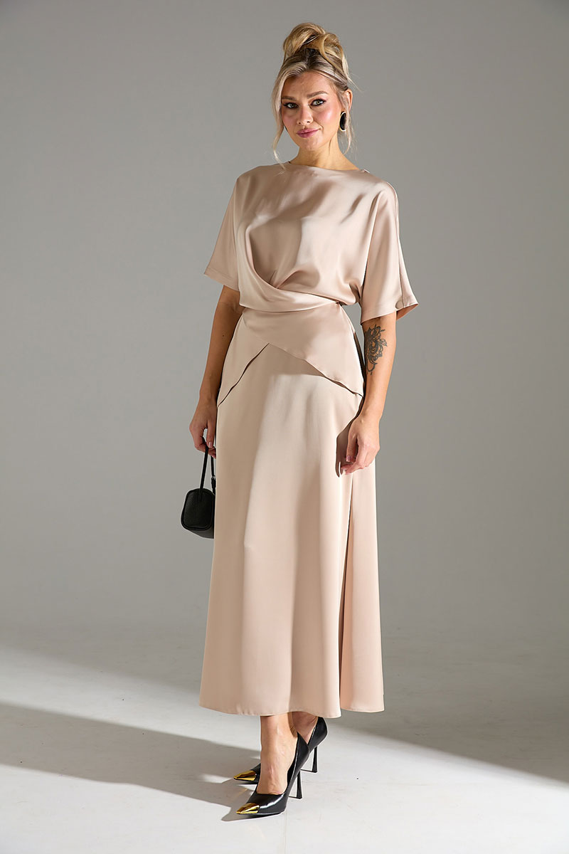 Костюм 2ка из лёгкой струящейся ткани с атласным благородным блеском, состоящий из блузки и юбки. Блузка свободного объёма, по переду имитация застежки на запАх. В комплекте шнур из основной ткани, которым можно приталить блузу, обвязав по кругу, или продеть через боковые швы и завязать по спинке. Юбка широкого объёма, длины "миди". Пояс юбки по спинке на резинке, сбоку застёжка на потайную молнию и пуговицу.